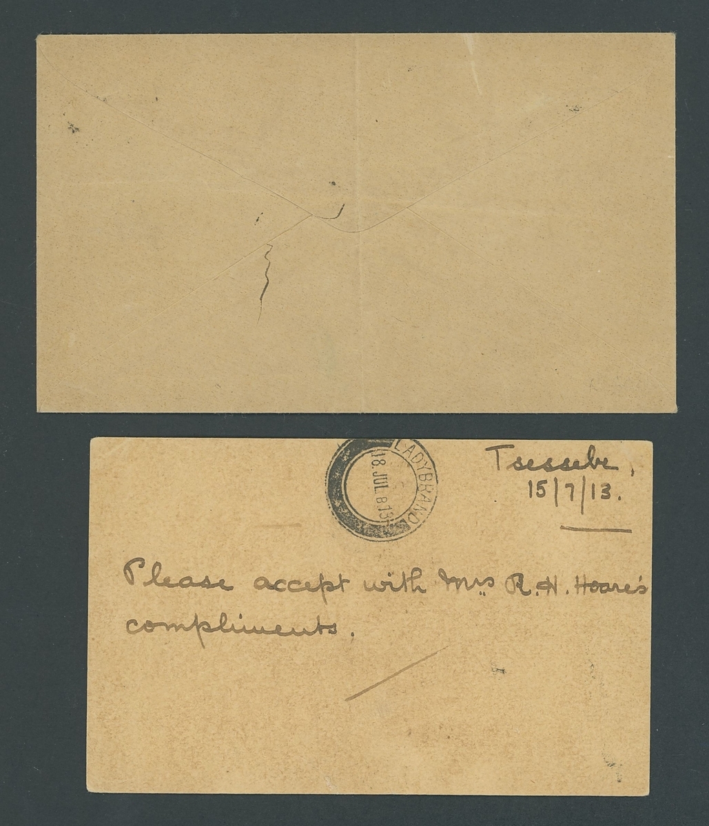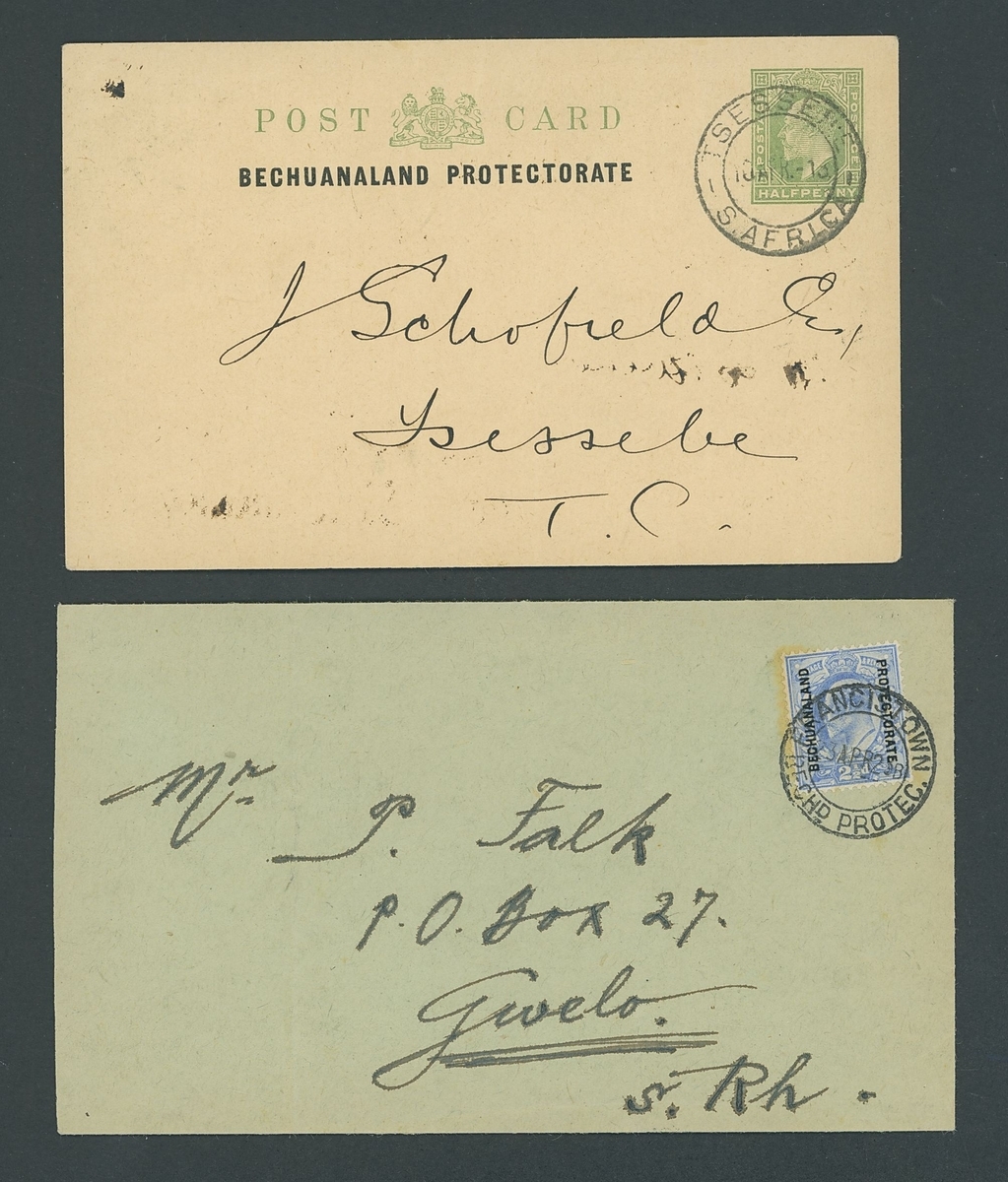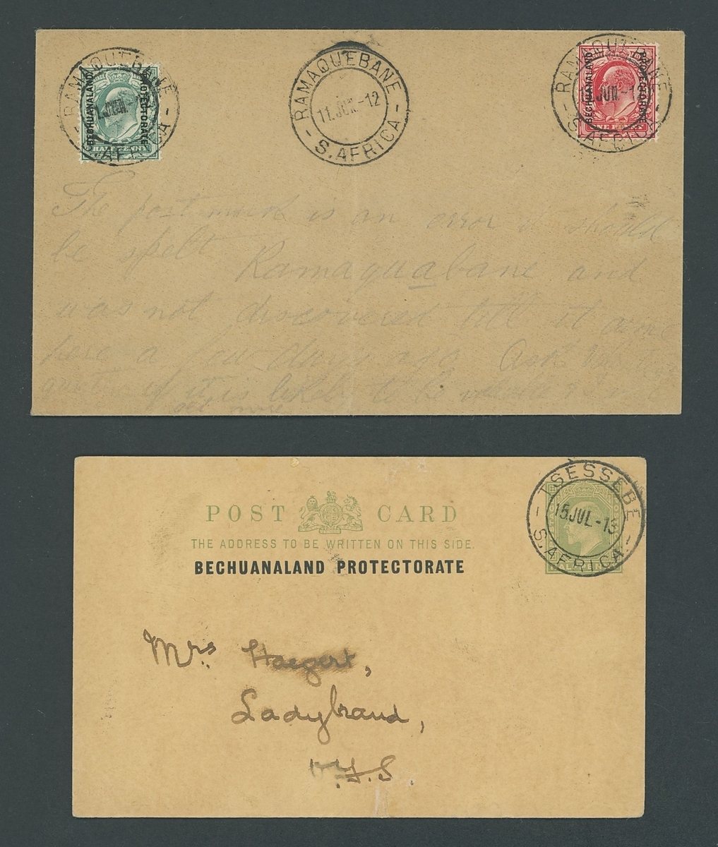 A small group (5) all franked with KE adhesives and with some rare postmarks comprising 1907 QV ½d. postal stationery card to London uprated with KE ½d. tied by