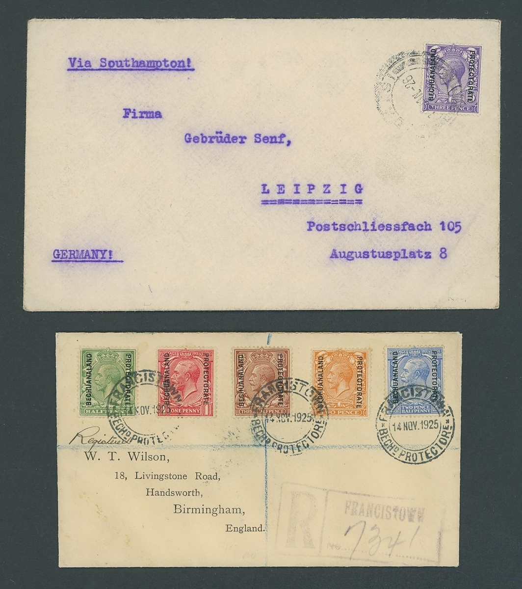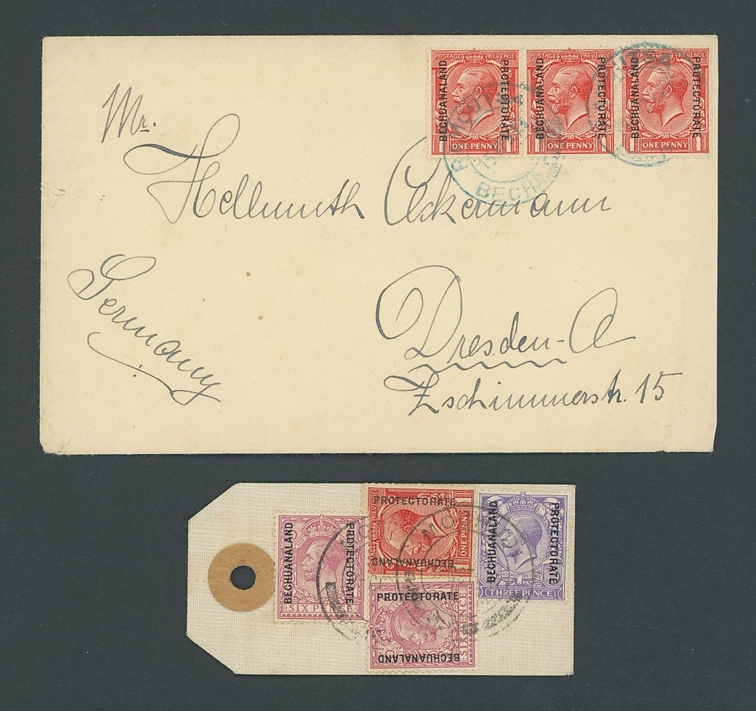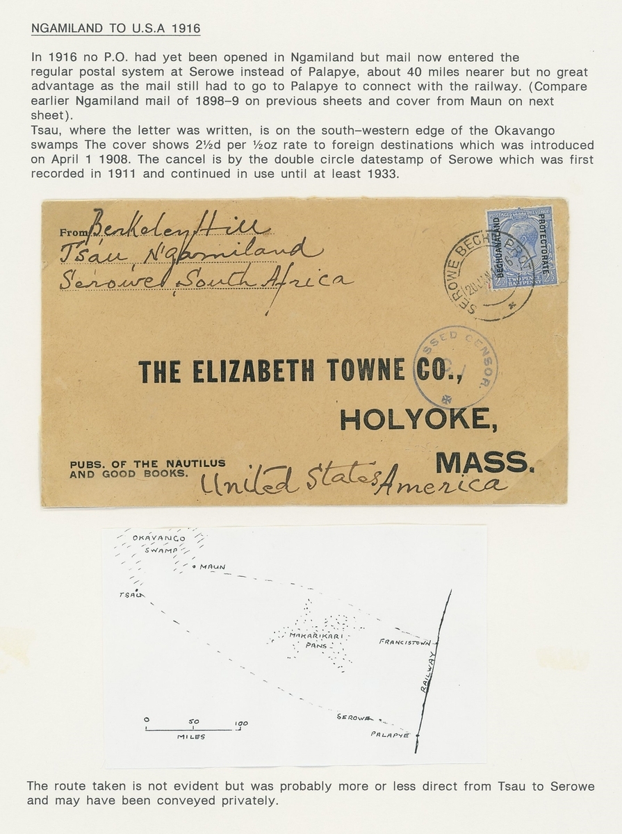 A group (10) all bearing KGV definitives including 1916 (Jan.) censored commercial cover from Tsau, Ngamiland (where there was no Post Office) to U.S.A., bearing 2½d. tied by