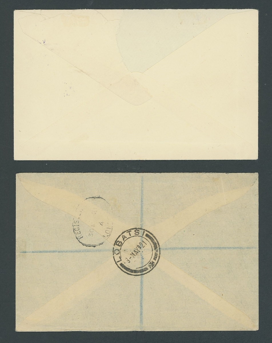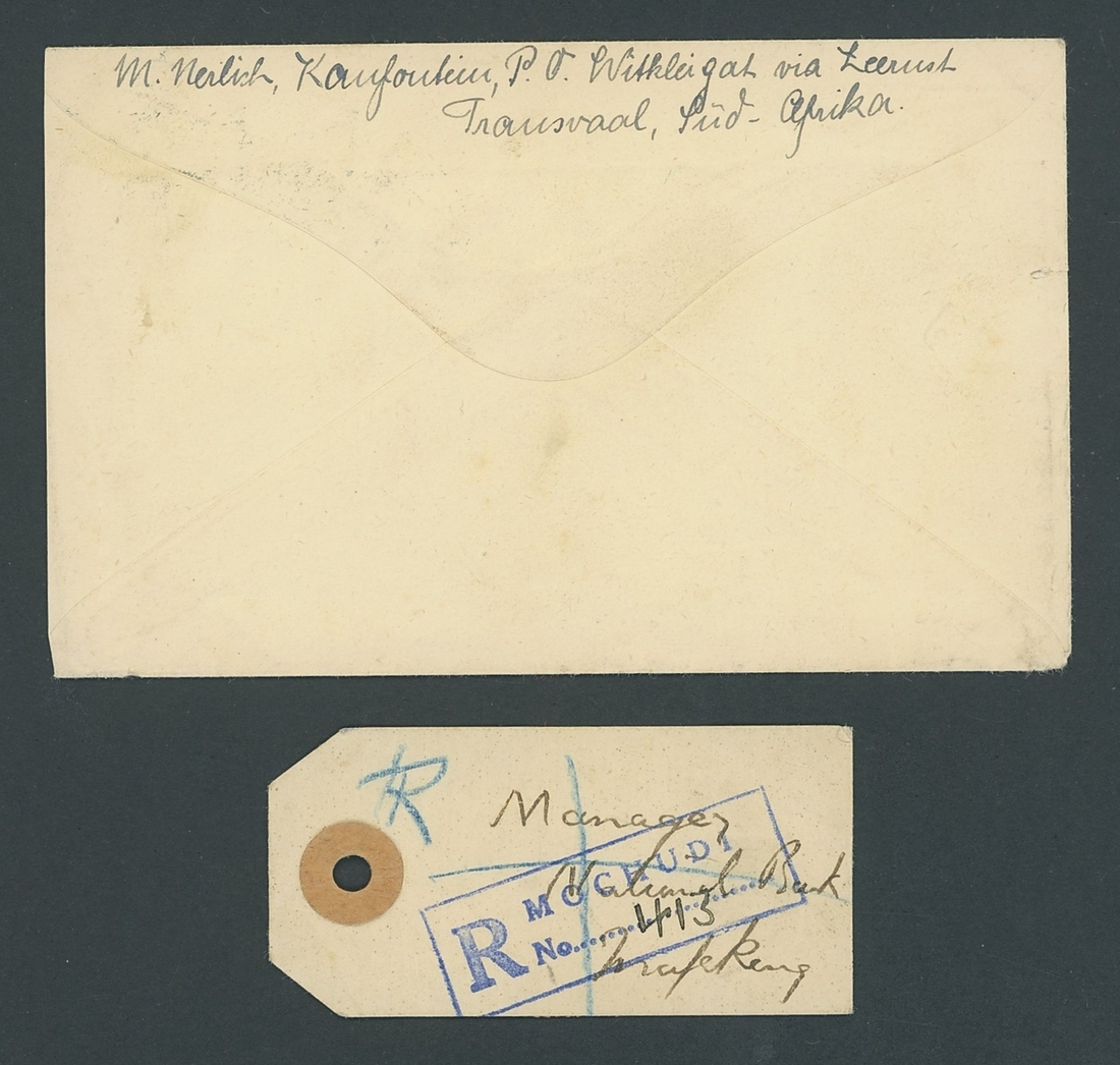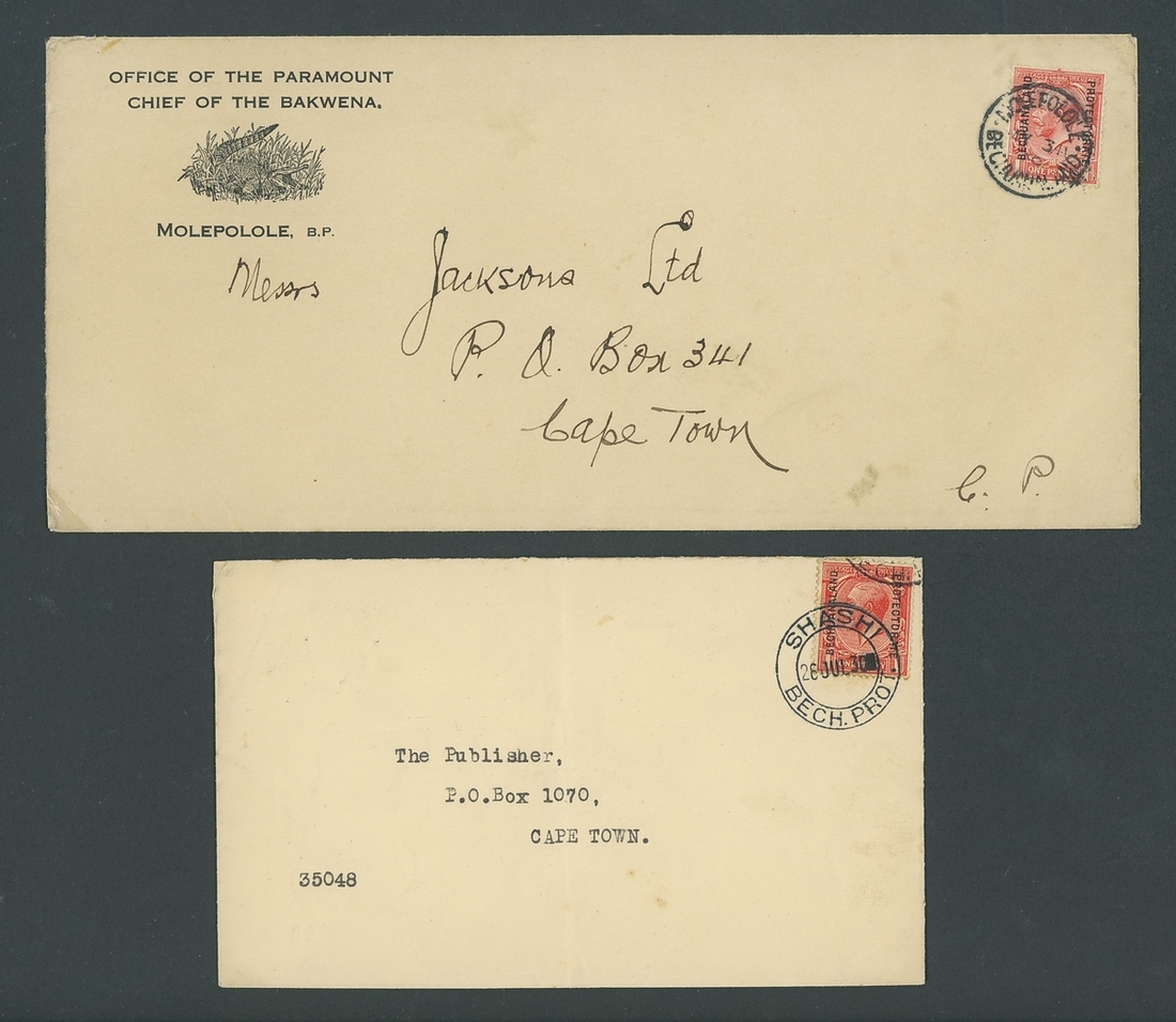 A group (10) all bearing KGV definitives including 1916 (Jan.) censored commercial cover from Tsau, Ngamiland (where there was no Post Office) to U.S.A., bearing 2½d. tied by