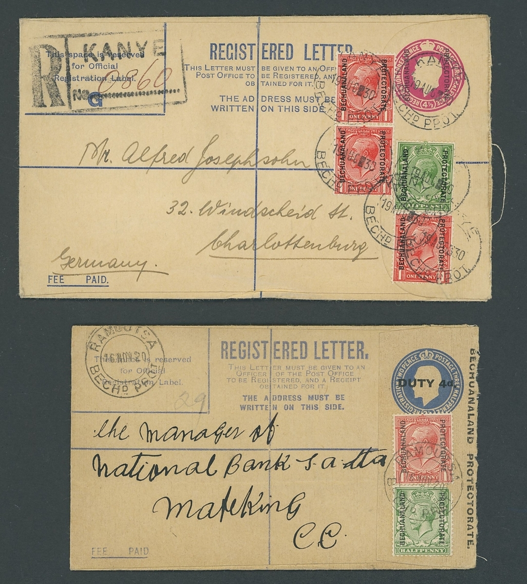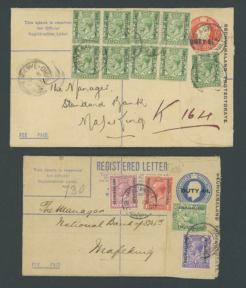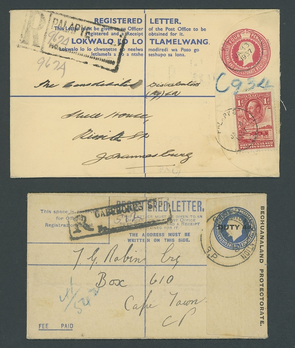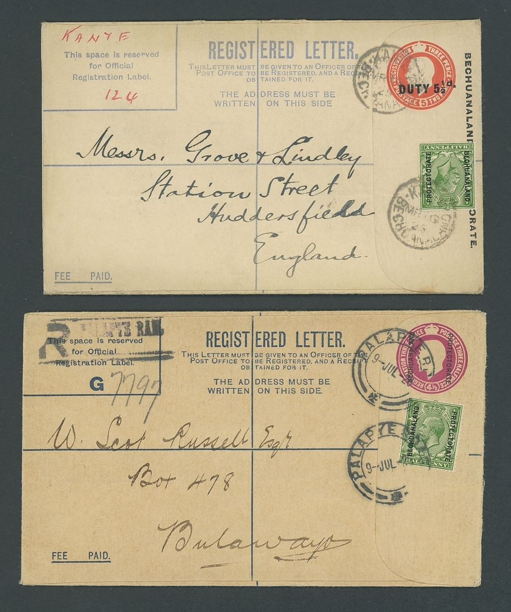 A collection (19) of Registered Letter postal stationery envelopes, some rare types, all uprated with KGV adhesives, with a range of frankings, destinations and postal markings including 4d. envelope uprated with 1932 1d. tied by scarce