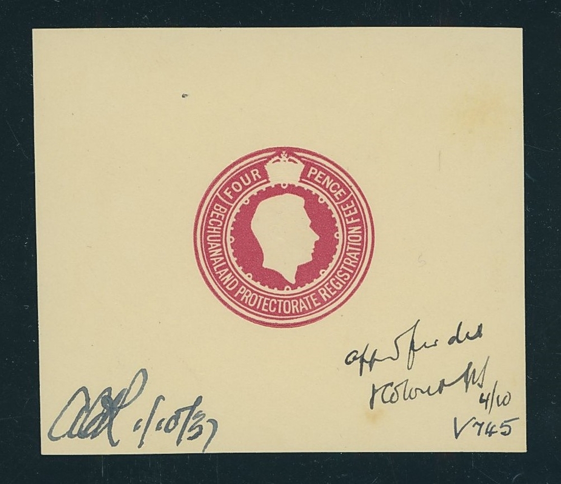 1937 embossed 4d. die proof in rose-carmine on thin card (73 x 64mm.), dated 1/10/37 and initialled, endorsed 'appd for die and colour 4/10' at lower right; fine and rare
