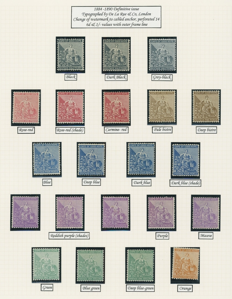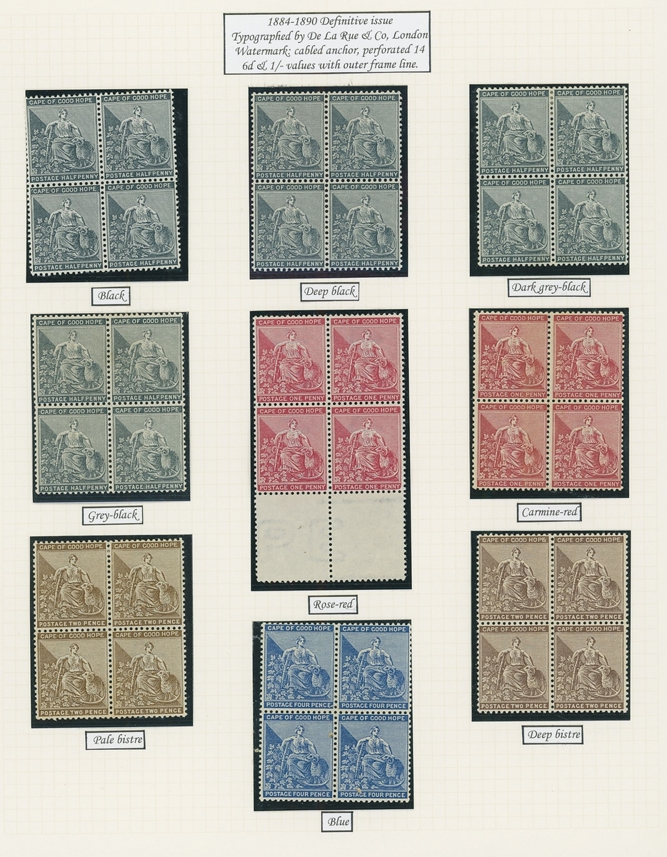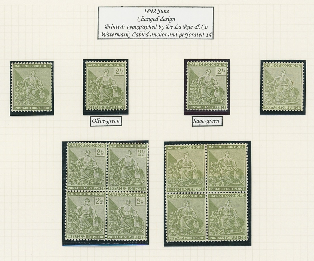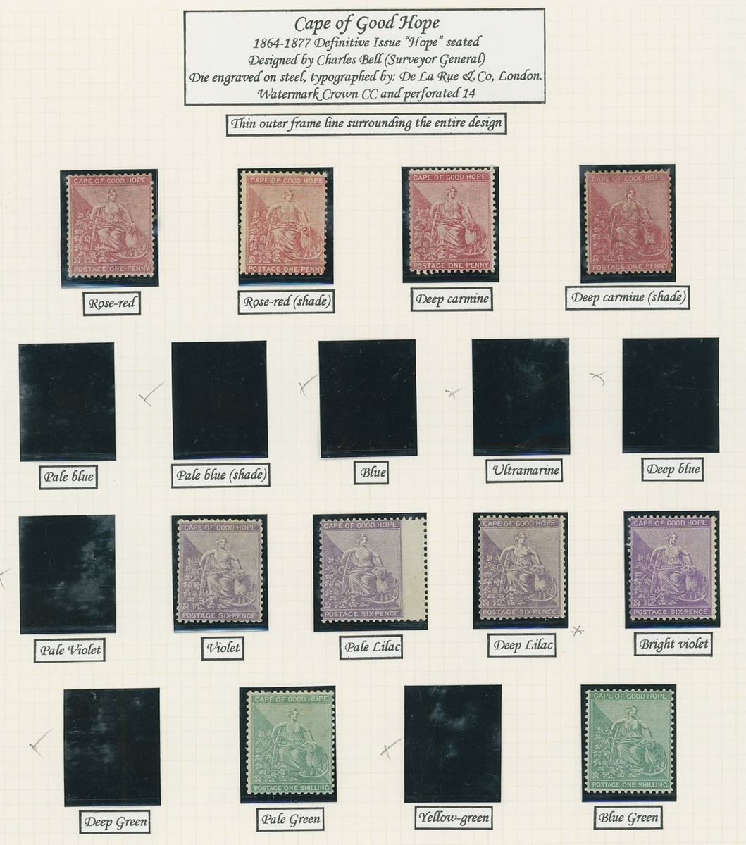 1864-1904 mainly mint Hope seated collection written up on Frank Godden album pages including 1864-77 shades with 1d. (4), 6d. (4) and 1/- (2), 1871-76 CC set to 1/- including ½d. (2), 1d. (2) and 4d. (3), 1874-76 1d. on 1/- green (3), 1879 3d. on 4d. mint (2) and used (2, including one variety