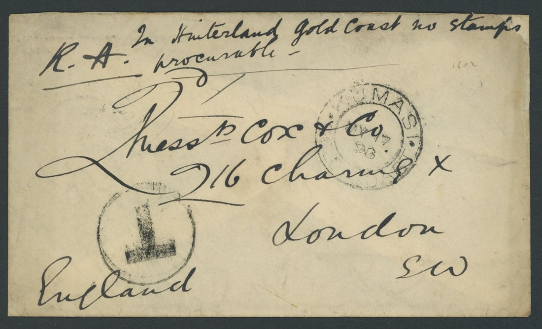1898 (17 May) envelope to London, headed "In Hinterland Gold Coast no stamps procurable", showing