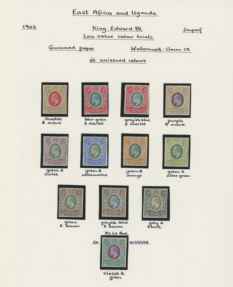 ½a. imperforate colour trials on gummed paper (12) all in unissued colour combinations comprising scarlet and ochre, blue-green and scarlet, greyish blue and scarlet, purple and ochre, green and violet, green and ultramarine, green and orange, green and olive-green, green and brown, greyish blue and brown, grey and black, and violet and green; fine and a very handsome assembly