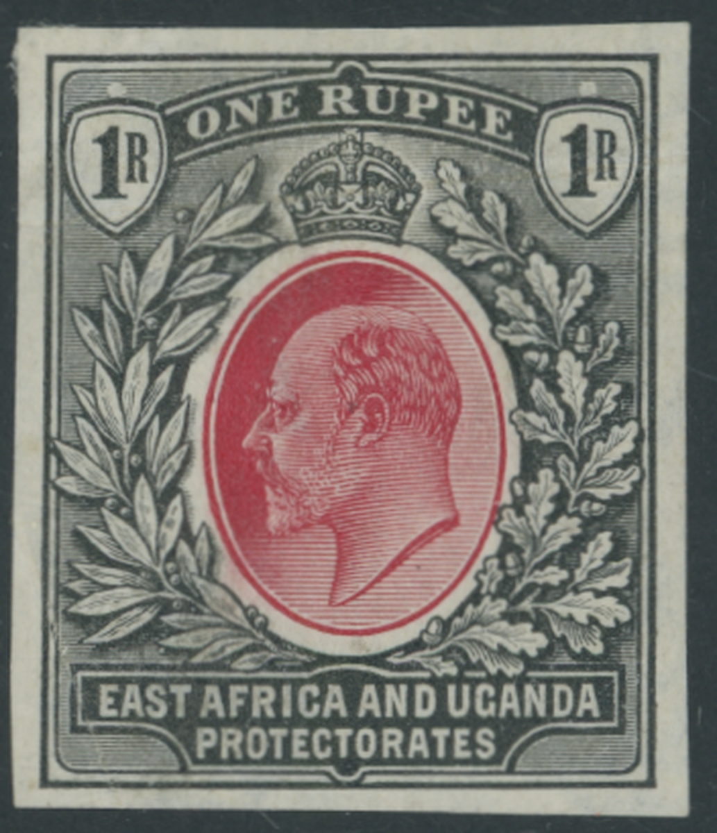 1r. imperforate colour trials (2) in unadopted colours, green and violet and scarlet, and black; both a little creased not affecting the appearance