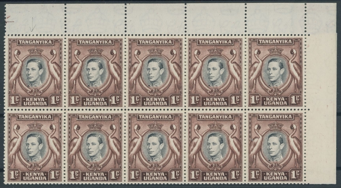 1c. black and chocolate-brown multiples showing varieties (3) comprising an upper right corner block of twenty showing variety