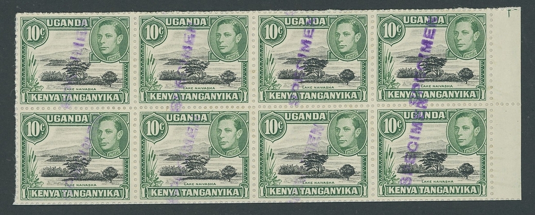 10c. black and green block of eight from the right of the unique archival sheet, each stamp handstamped