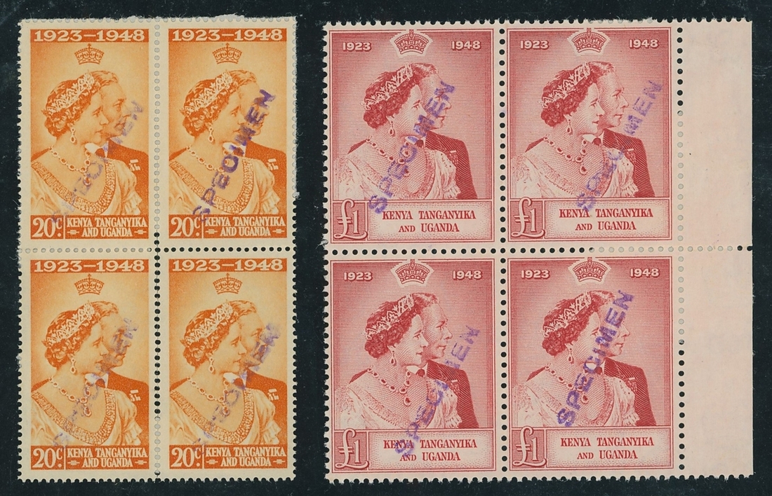 1948 Silver Wedding 20c. and £1, each in a block of four handstamped