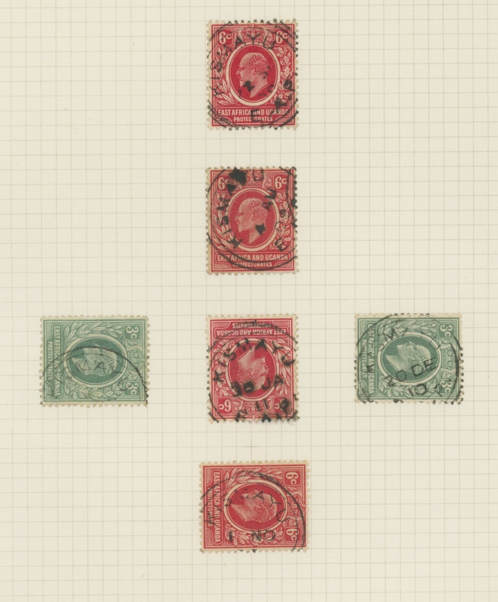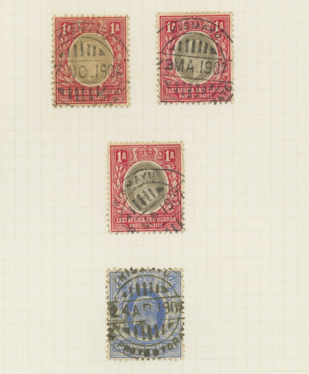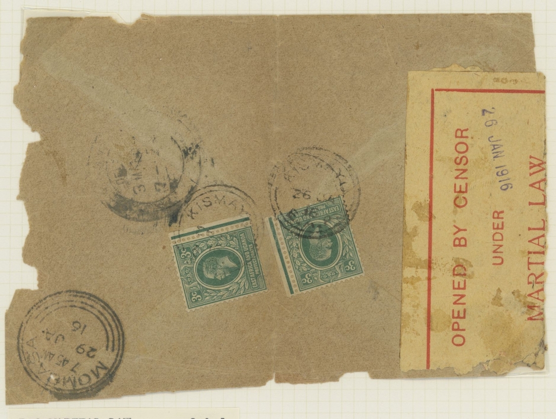 1906-1919 collection of cancellations and covers, including Kismayo hatched circle datestamps on KE adhesives (4) and double-ring datestamps on KE adhesives (6) and KGV adhesives (12), Yonte double-ring d.s. on KGV 1a.; also 1916 censored cover (ragged edges) from Kismayu to Karachi, 1916 OHMS cover from Mombasa to Kismayu (backstamped on arrival), 1916 cover from Yonte to Jubaland with Passed by Censor Kismayu cachet, 1919 cover bearing 6c. and 4c. on 6c. provisional from Kismayu to England sent by J.O.W. Hope, District Commissioner in Jubaland. A scarce lot