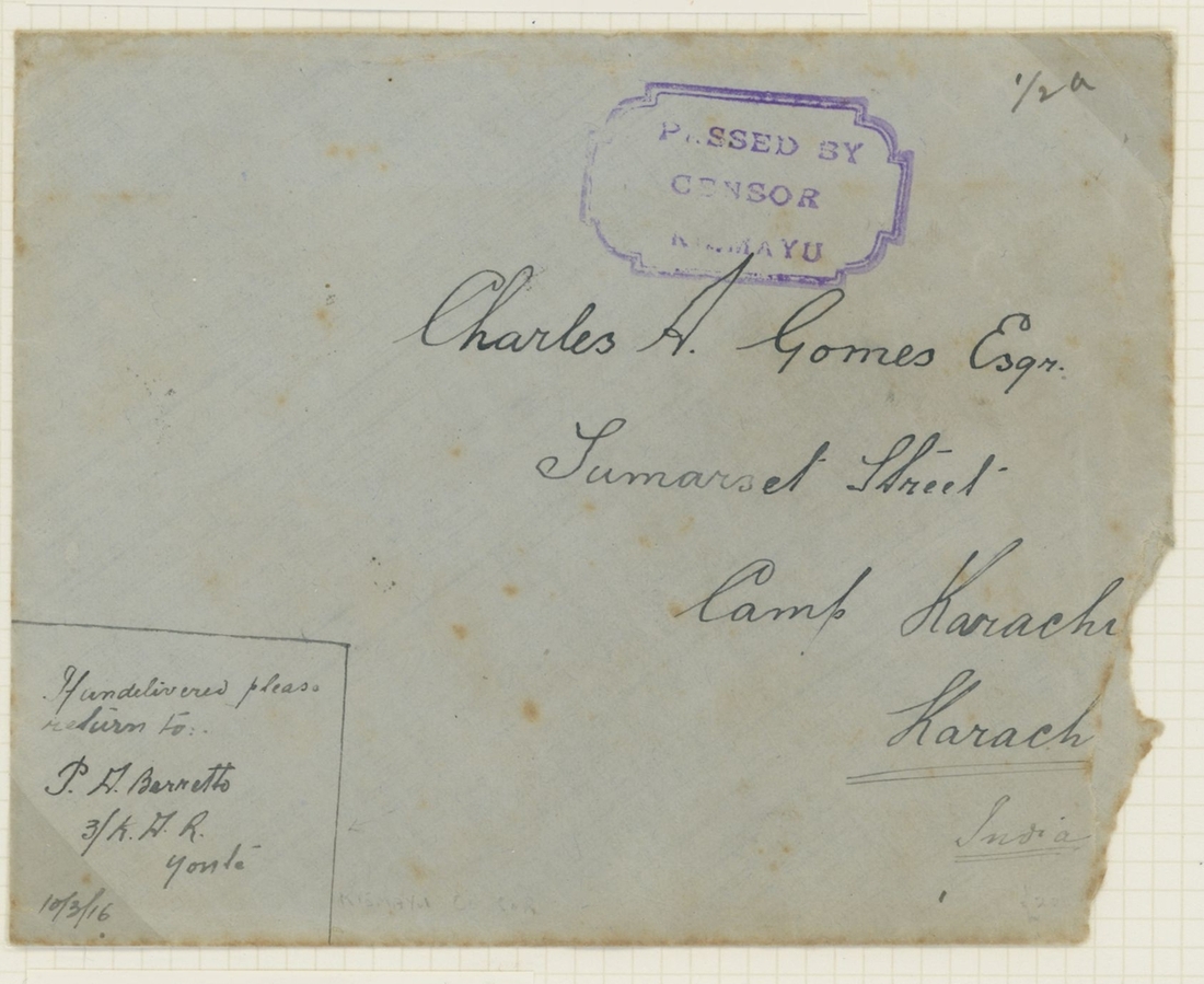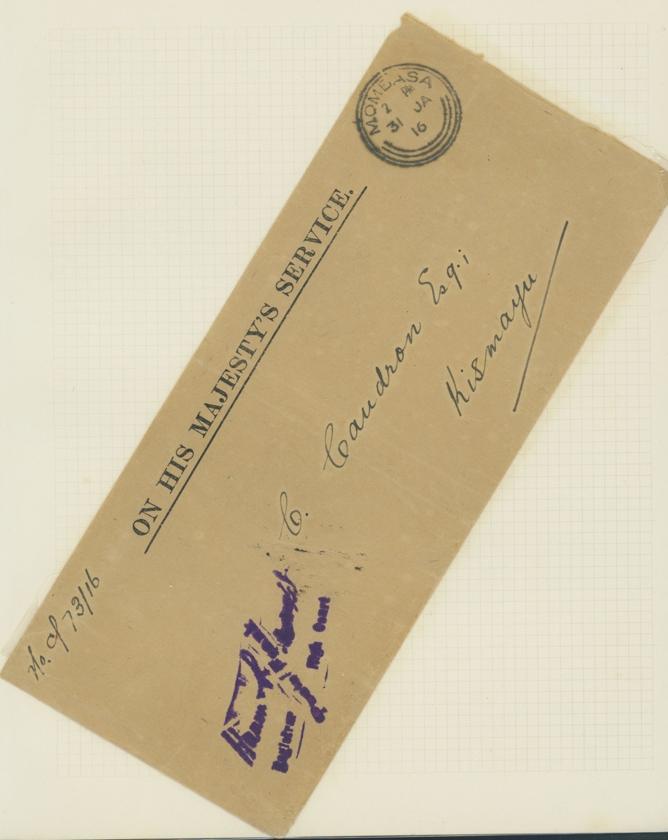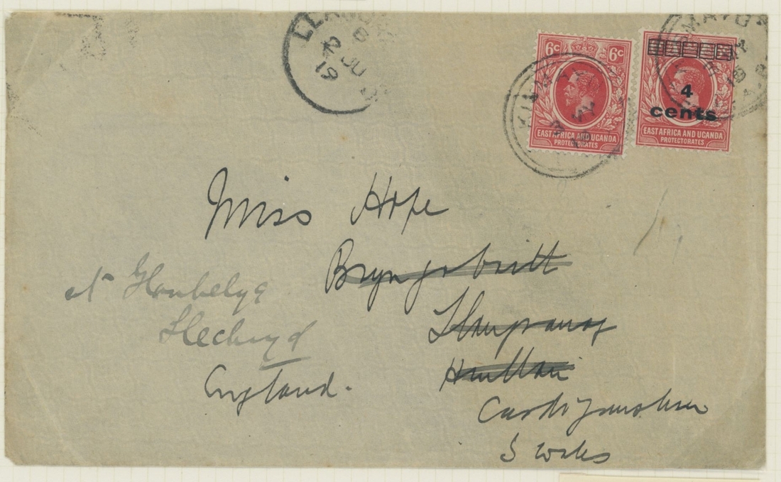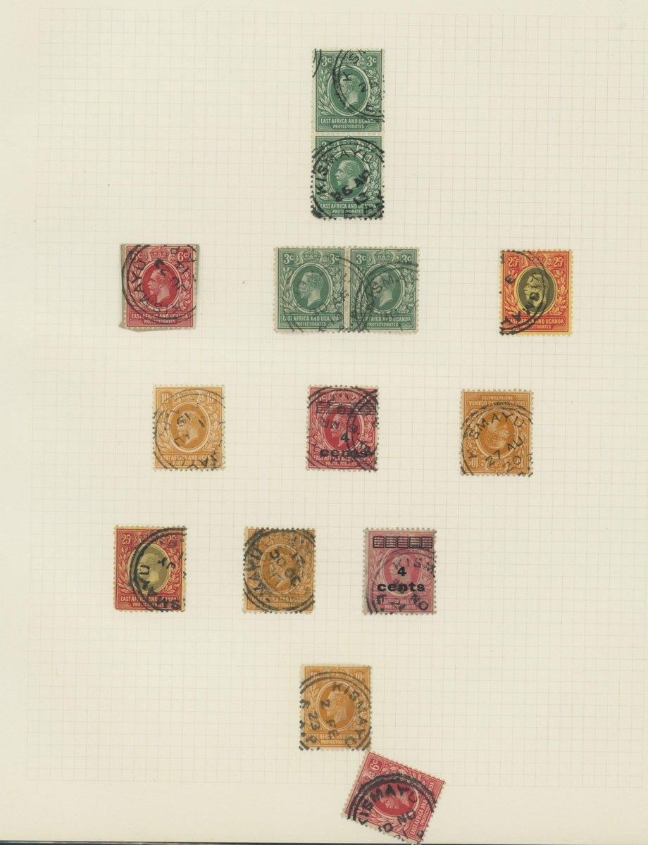 1906-1919 collection of cancellations and covers, including Kismayo hatched circle datestamps on KE adhesives (4) and double-ring datestamps on KE adhesives (6) and KGV adhesives (12), Yonte double-ring d.s. on KGV 1a.; also 1916 censored cover (ragged edges) from Kismayu to Karachi, 1916 OHMS cover from Mombasa to Kismayu (backstamped on arrival), 1916 cover from Yonte to Jubaland with Passed by Censor Kismayu cachet, 1919 cover bearing 6c. and 4c. on 6c. provisional from Kismayu to England sent by J.O.W. Hope, District Commissioner in Jubaland. A scarce lot