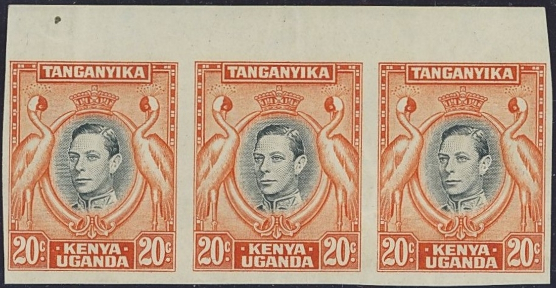 20c. black and orange, imperforate horizontal strip of three from the top of the sheet on Crown CA paper, large part original gum; some gum creasing though of fine appearance. An uncatalogued variety, known not to be printer's waste; very rare