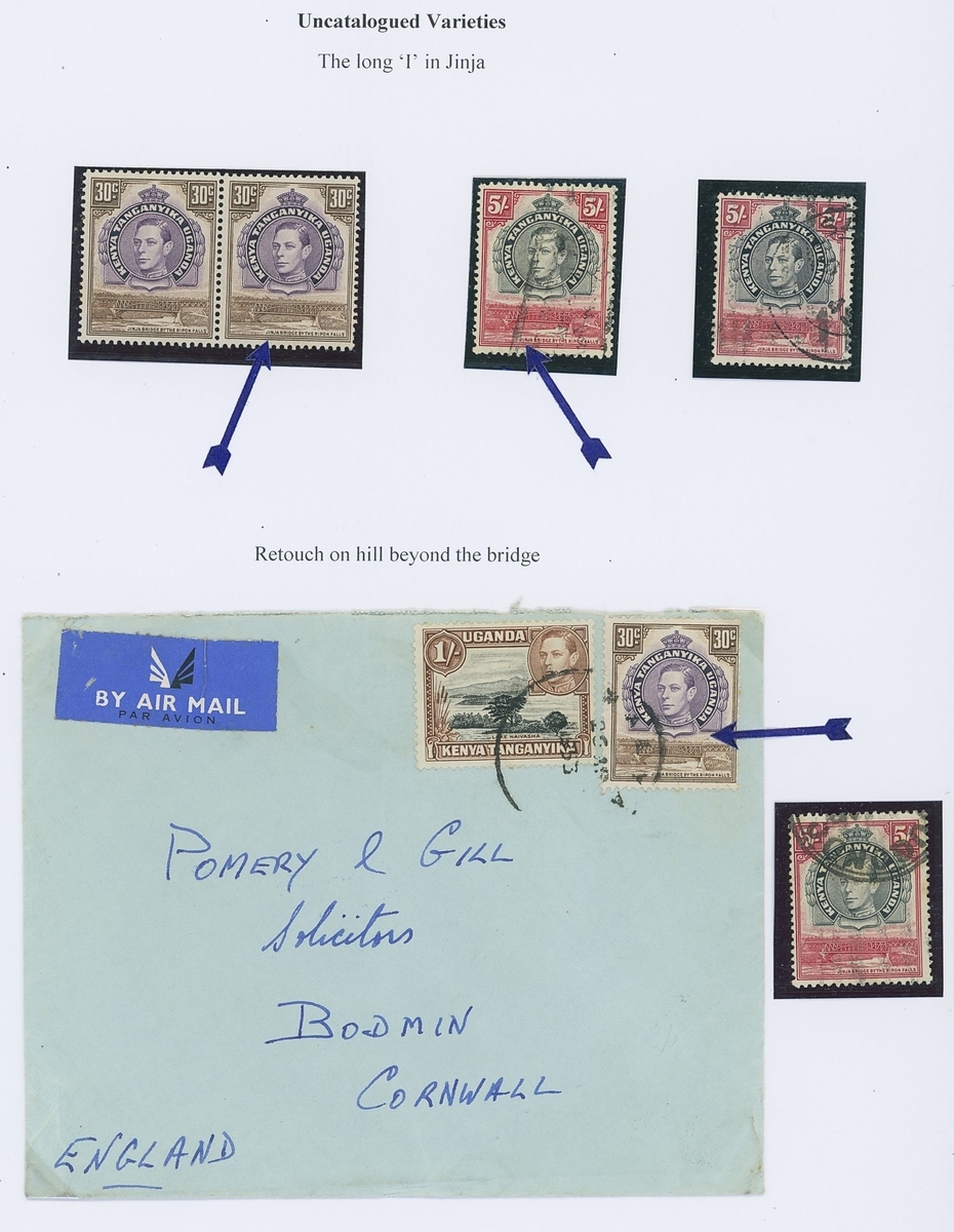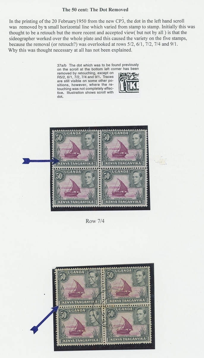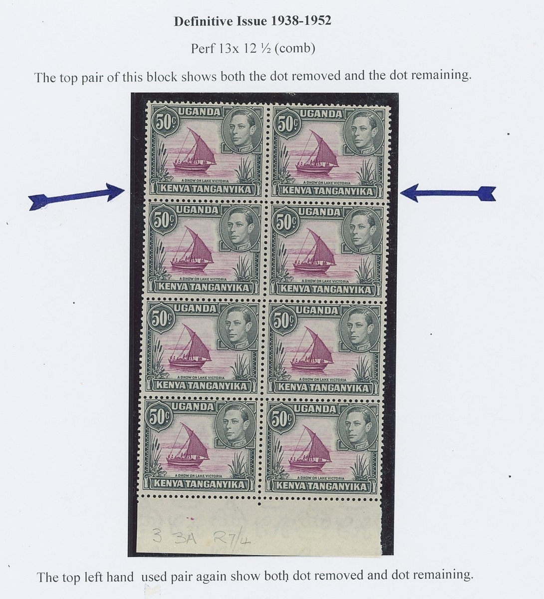 50c. reddish purple and black group comprising a mint block of eight from the foot of the sheet, the upper pair showing dot removed in pair with normal, and the same variety in a mint block of four and in used blocks of four and eight, also a few unlisted varieties on a page (5) the long