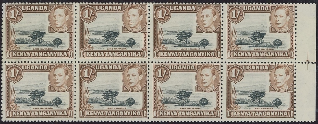 1/- black and yellowish-brown, perf. 11 x 13¾ block of eight from the right of the sheet, showing mountain retouch at both positions [5/10] and [6/7], unused without gum, rare; also 10c. black and green block of eight from the right of the sheet showing mountain retouch at [6/7], unmounted mint. S.G. 135a, 145ac, 145ad, £6,000+