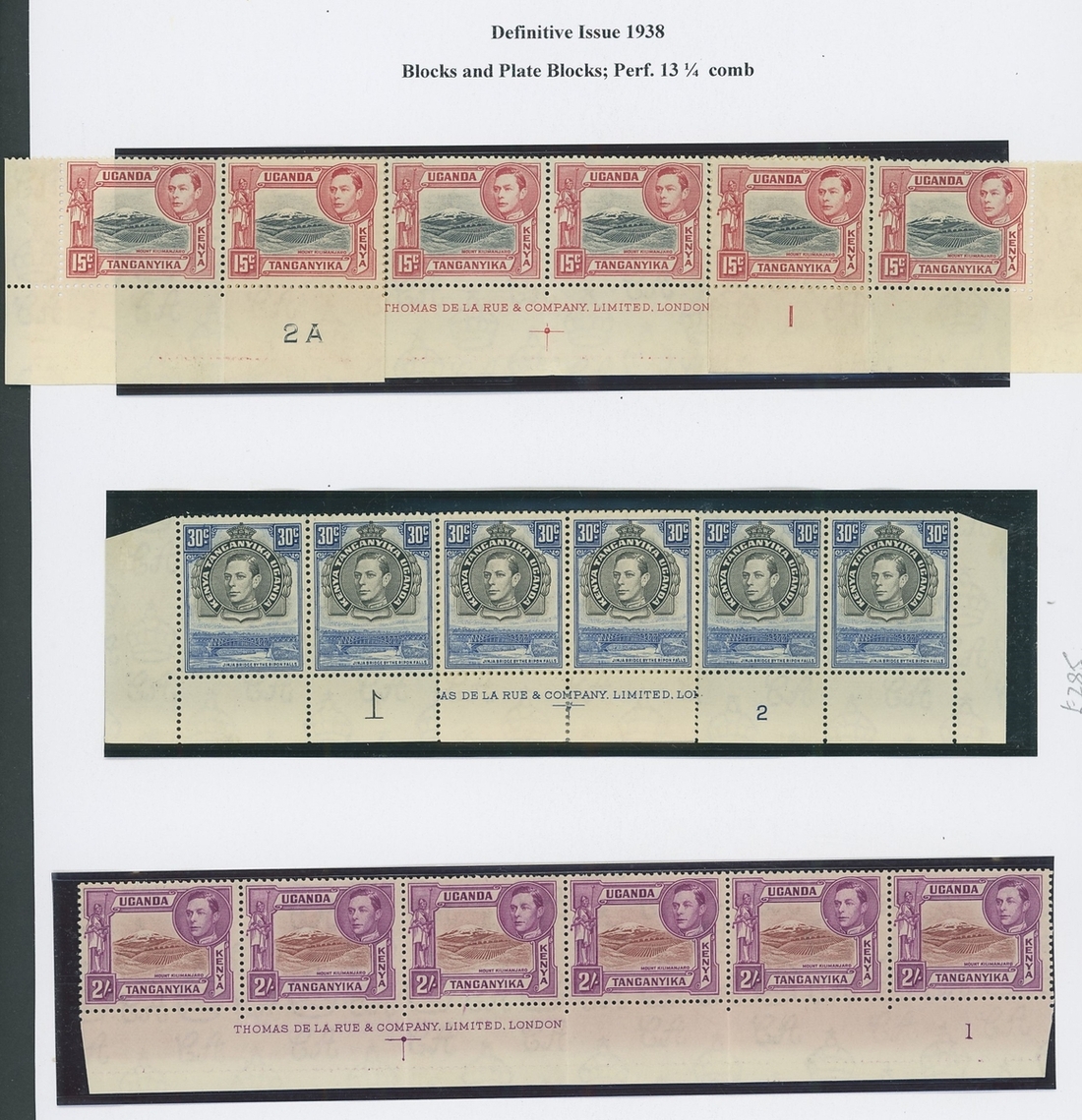 Perf. 13¼ group of strips (3) and blocks of four (2) comprising 15c. black and rose-red and 30c. black and dull violet-blue imprint strips of ten (folded for display) and 2/- lake-brown and brown-purple imprint strip of six, all with plate numbers and 20c. black and orange and 30c. black and dull violet blue blocks of four; fine mint, rare multiples. S.G. 137, 139, 141, 146, £2,500+