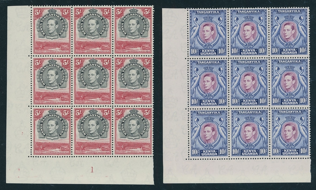 5/- black and carmine and 10/- purple and blue, perf 13¼x13¾, both in a lower left corner block of nine, the 5/- with plate number '1'; superb unmounted mint, scarce large multiples. S.G. 148b, 149b, £1,080+