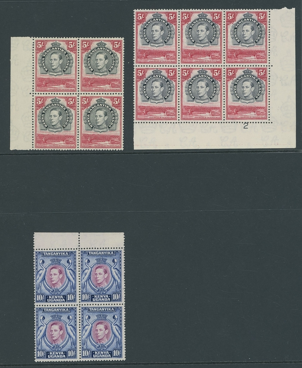 5/- black and carmine, perf 13¼x13¾, a block of four from the left of the sheet and a lower right corner block of six and 10/- purple and blue block of four from the top of the sheet; all but the 5/- block of four unmounted mint, very fine. S.G. 148b, 149b, £810