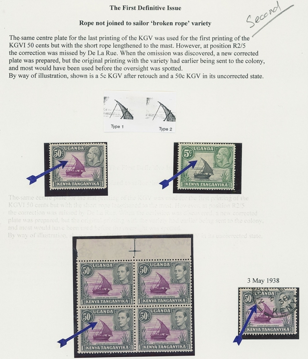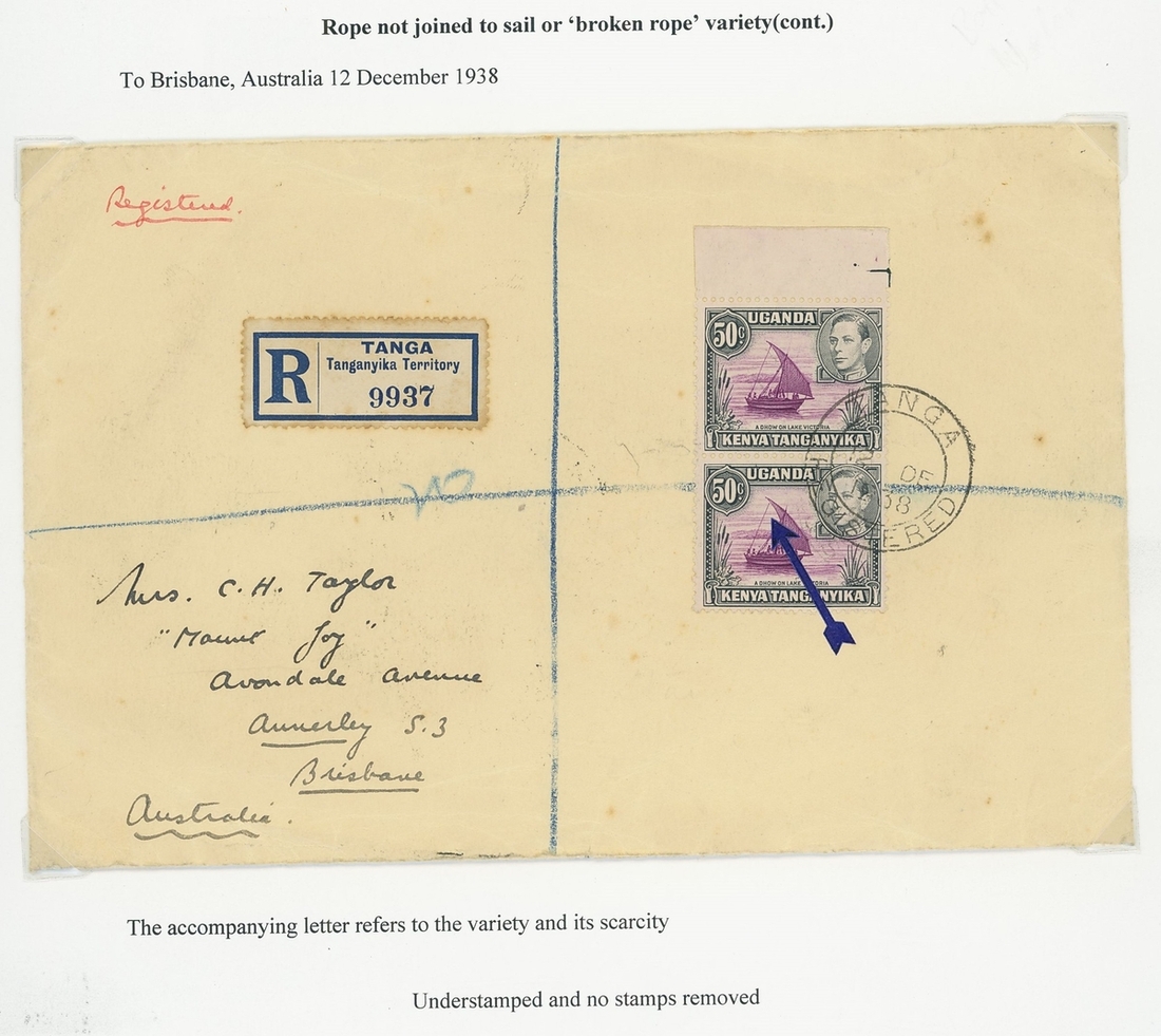 A small mint and used group on two exhibition pages demonstrating the rope not joined to sail variety comprising 1935 KGV 5c. rope joined to sail and 50c. rope not joined to sail and then 1938-52 50c. purple and black block of four from the top of the sheet, the lower-left stamp showing rope not joined to sail, also a used example with the same variety and a vertical marginal pair used on Registered cover to Brisbane showing rope not joined to sail in pair with normal; a fine group. S.G. 111a, 116, 144, 144a, £980+