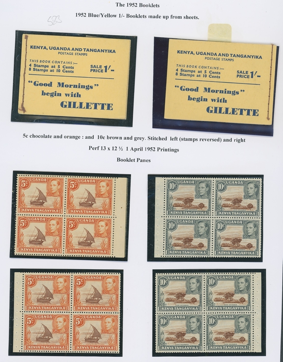 1938-52 group of complete booklets on exhibition pages comprising 1938 3/40c. pink (2), 1952 1/- blue on yellow stapled at right and two further complete 1/- yellow booklets stitched, one at left and the other at right, also a few booklet panes, fine. S.G. SB3, SB4, SB4a, £1,450+