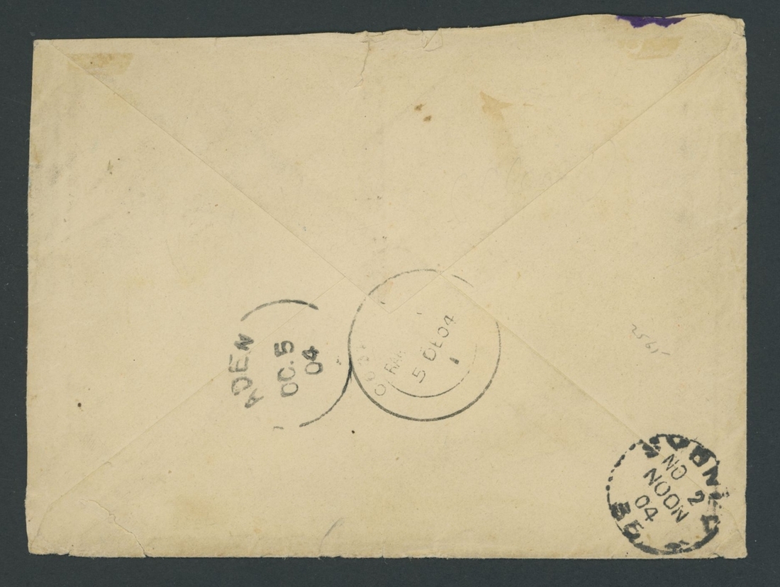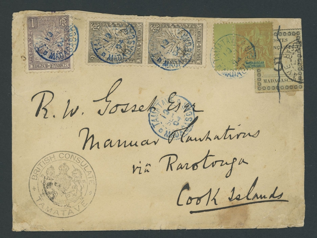 1904 (10 Sept.) envelope from Tamatave to Cook Islands, bearing French P.O. 1891 5c. (tied by pen stroke), Madagascar and Dependencies 1896 20c. and 1903 1c. and 2c. vertical pair, all tied by blue Tamatave c.d.s., showing circular
