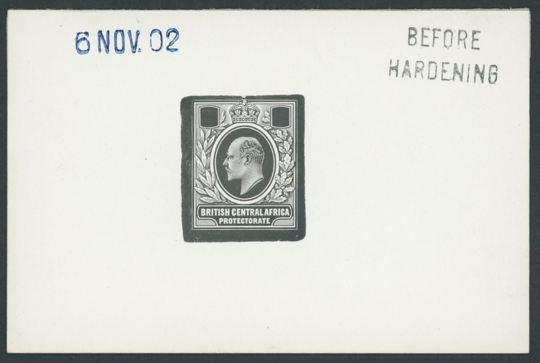 1902 small format master die proof with uncleared value tablets, in black on white glazed card (90 x 60mm.), marked