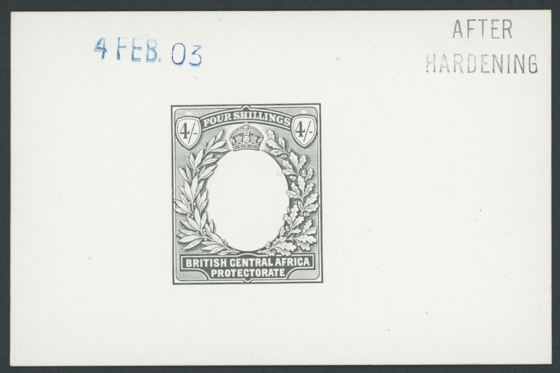 4/- die proof with blank vignette in black on glazed card (92 x 60mm.), marked
