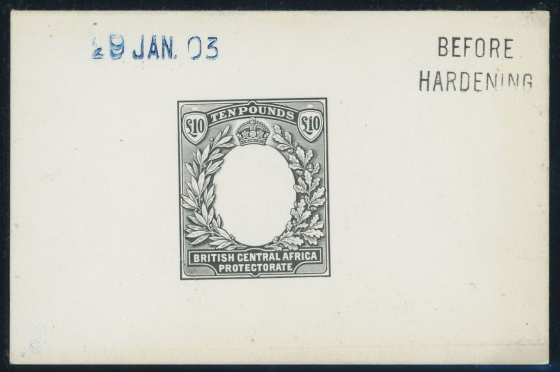 £10 die proof with blank vignette in black on glazed card (92 x 60mm.), marked