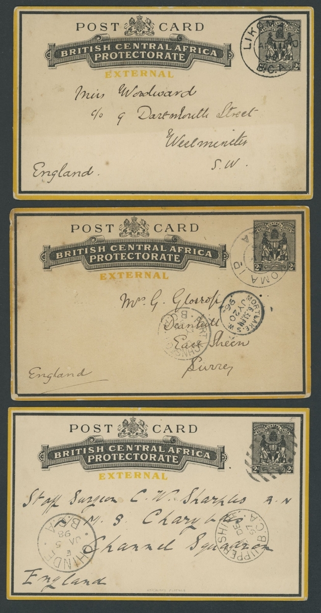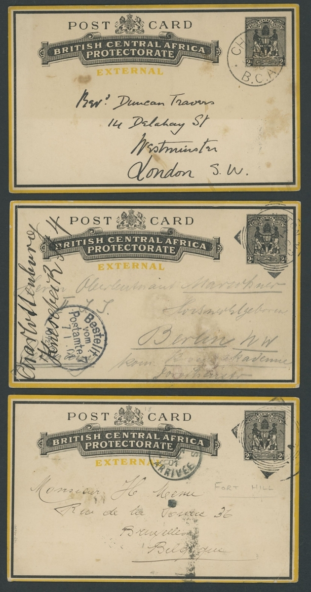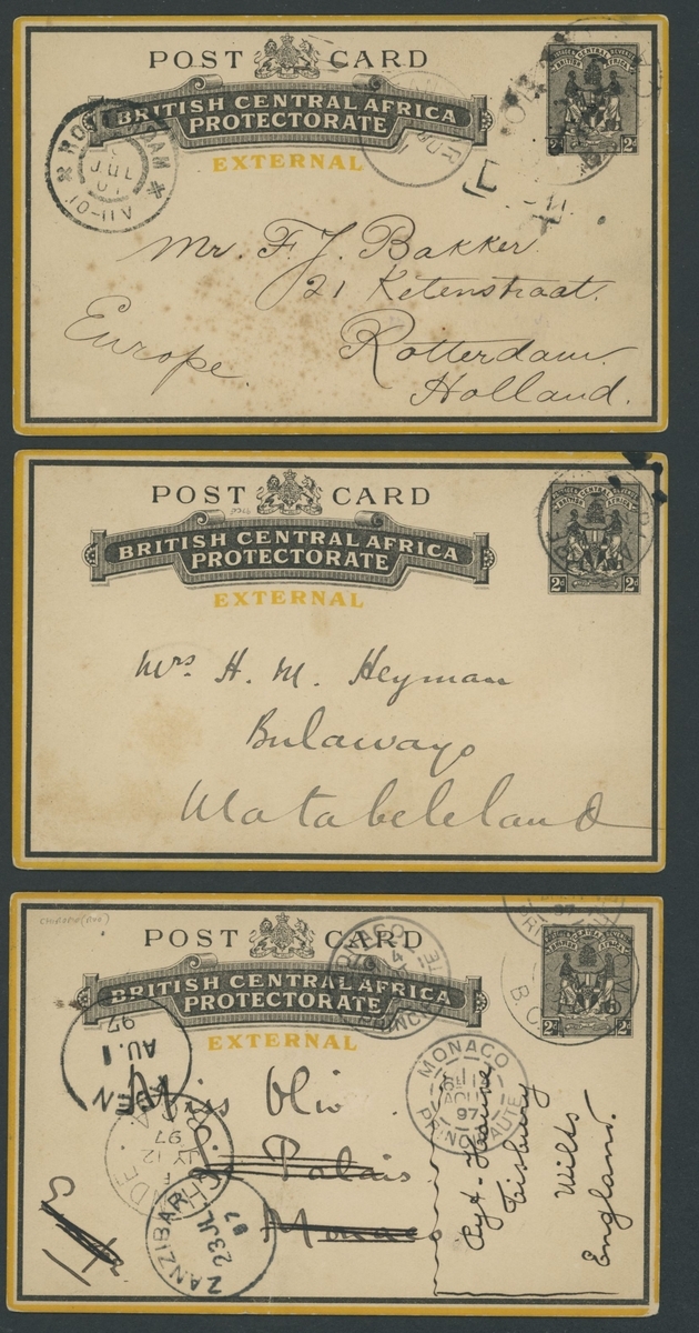 1895-1901 2d. External stationery cards (8) from Cholo to Rotterdam, Blantyre to Bulawayo, Tchiromo to Monaco (vertical crease) and re-addressed to London showing Chinde, Zanzibar and Aden transit datestamps, Likoma Id to England (2), B.C.A. Gunboat "Dove" at Fort Johnston to England, Fort Hill to Belgium, Chinde to London and from Fort Johnston to Berlin. A good group