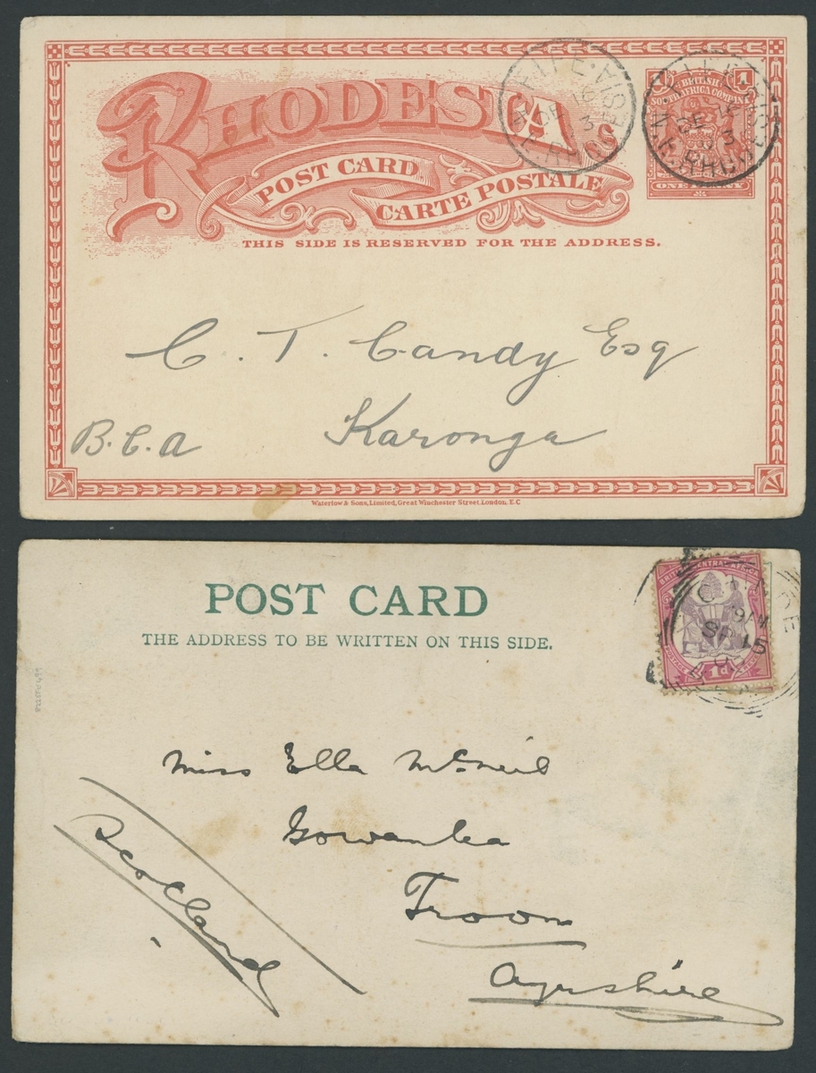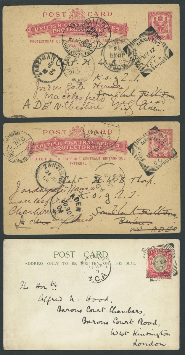 1902 (15 Sept.) card (fox marks) from Chinde to Scotland bearing 1897 1d.; 1904 (12 and 19 May) 1d. stationery cards from Fort Manning to an Officer in the Somaliland Field Force at Berbera and re-addressed to England; 1907 (24 May) picture postcard from Chiromo to London; also 1903 (16 Dec.) Rhodesia 1d. stationery card from Fife to Karonga