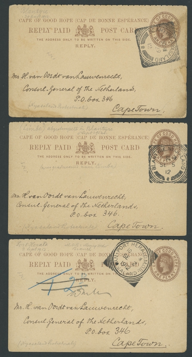 The following nine lots comprise Cape of Good Hope reply post cards sent by H. van Oordt von Lauwenrecht when Consul General for the Netherlands in Cape Town during 1912. He wrote to all postmasters in Southern Africa: