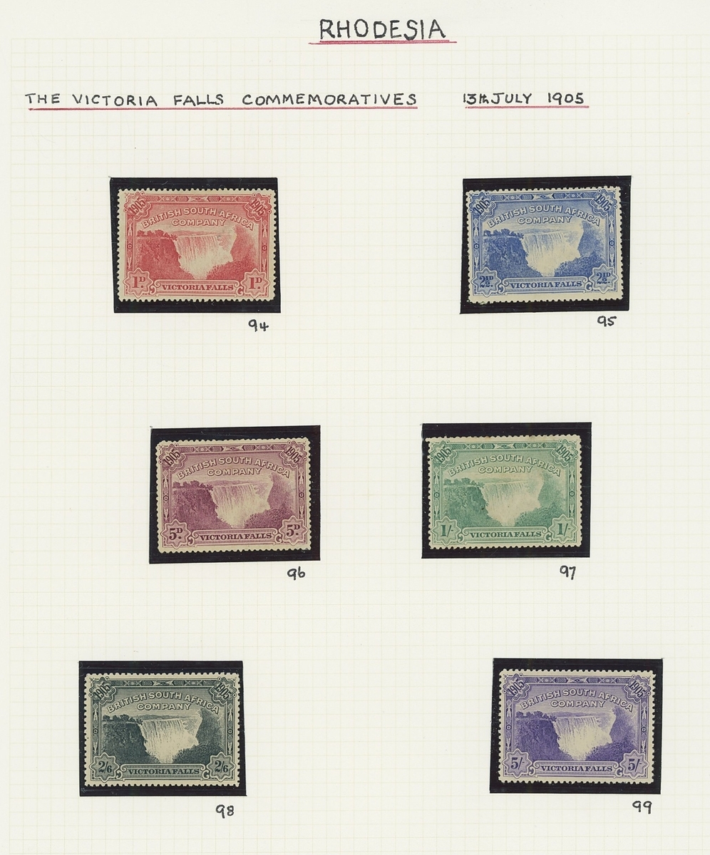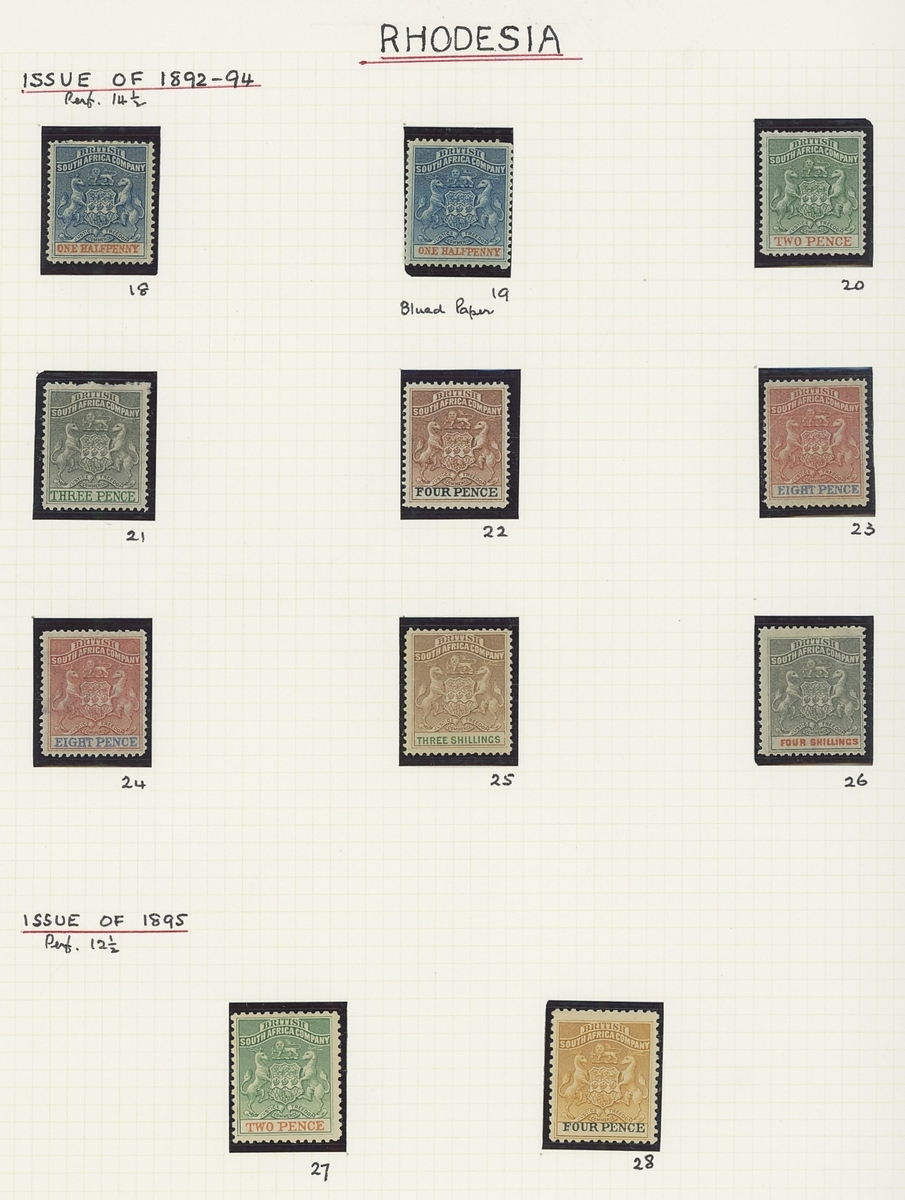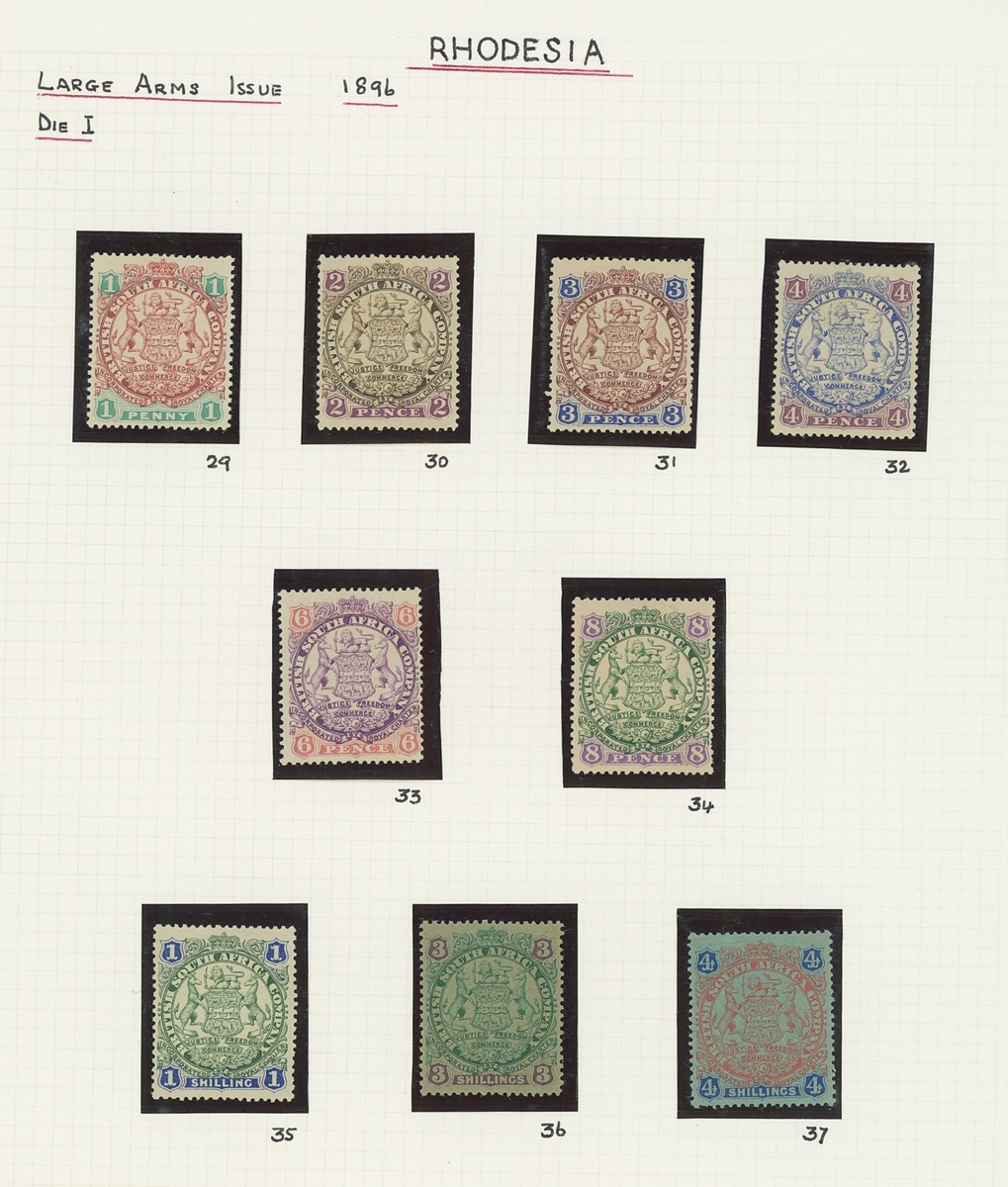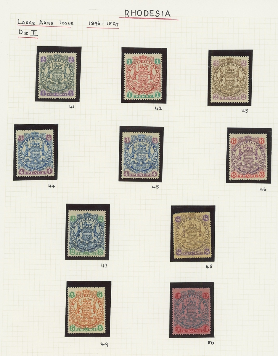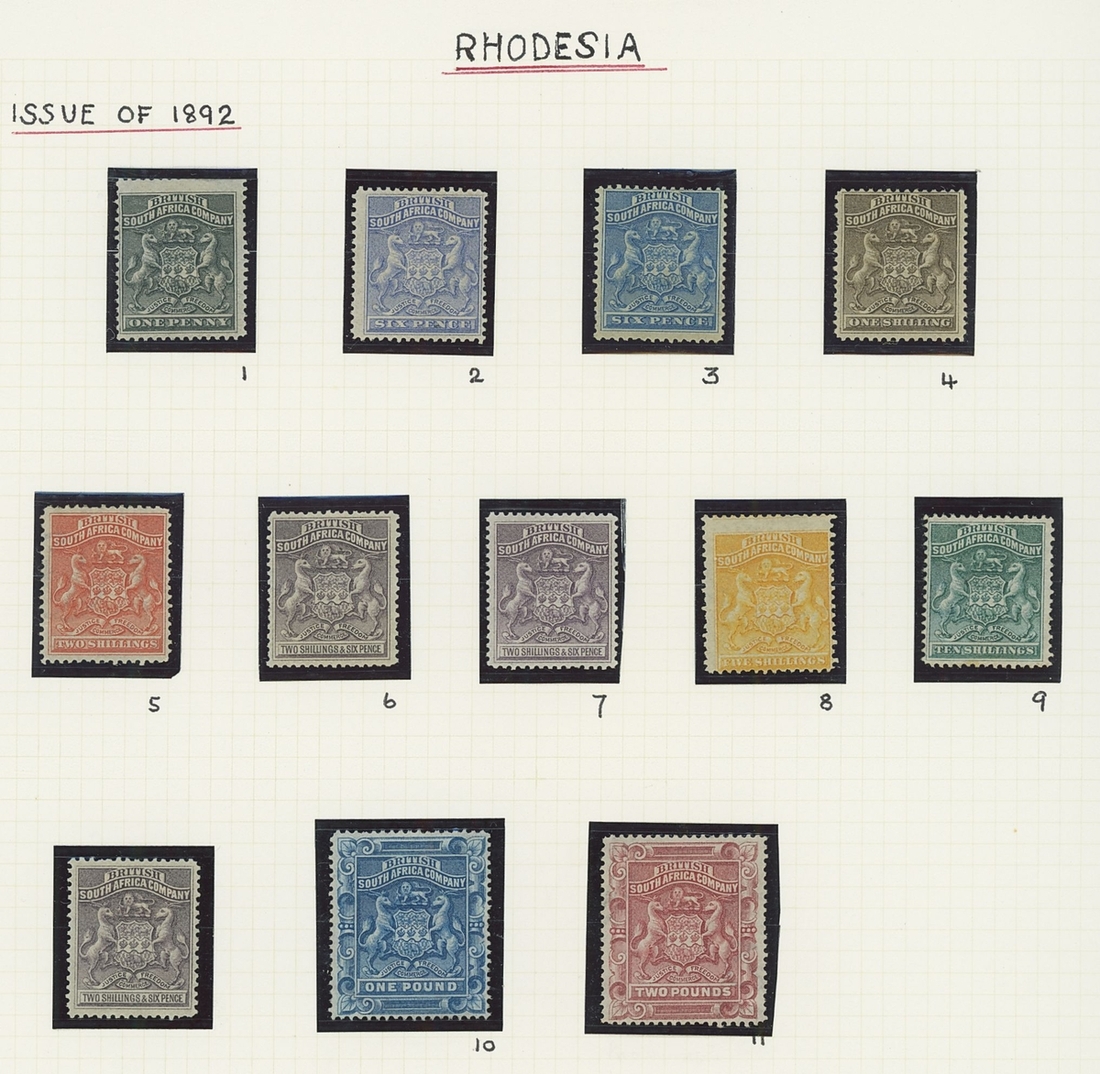 1892-1909 mint collection on album pages including 1892 Arms 1d. to £2, 1892-94 set to 4/- and Perkins Bacon 2d. and 4d., 1896-97 Die I set to 4/-, Die II set to 10/-, 1896 Cape provisionals set to 1/- and with a few minor varieties additionally (6), 1897 set to £1, 1905 Falls set to 5/- and with a 5/- block of four, 1909-12 Rhodesia overprint set to £1 (2 £1 values), 1898-1908 Arms to £2 and with 1d. imperforate between stamp and margin; good to fine mint. S.G. cat value £6,000+