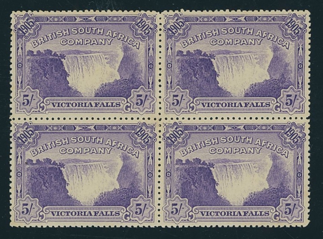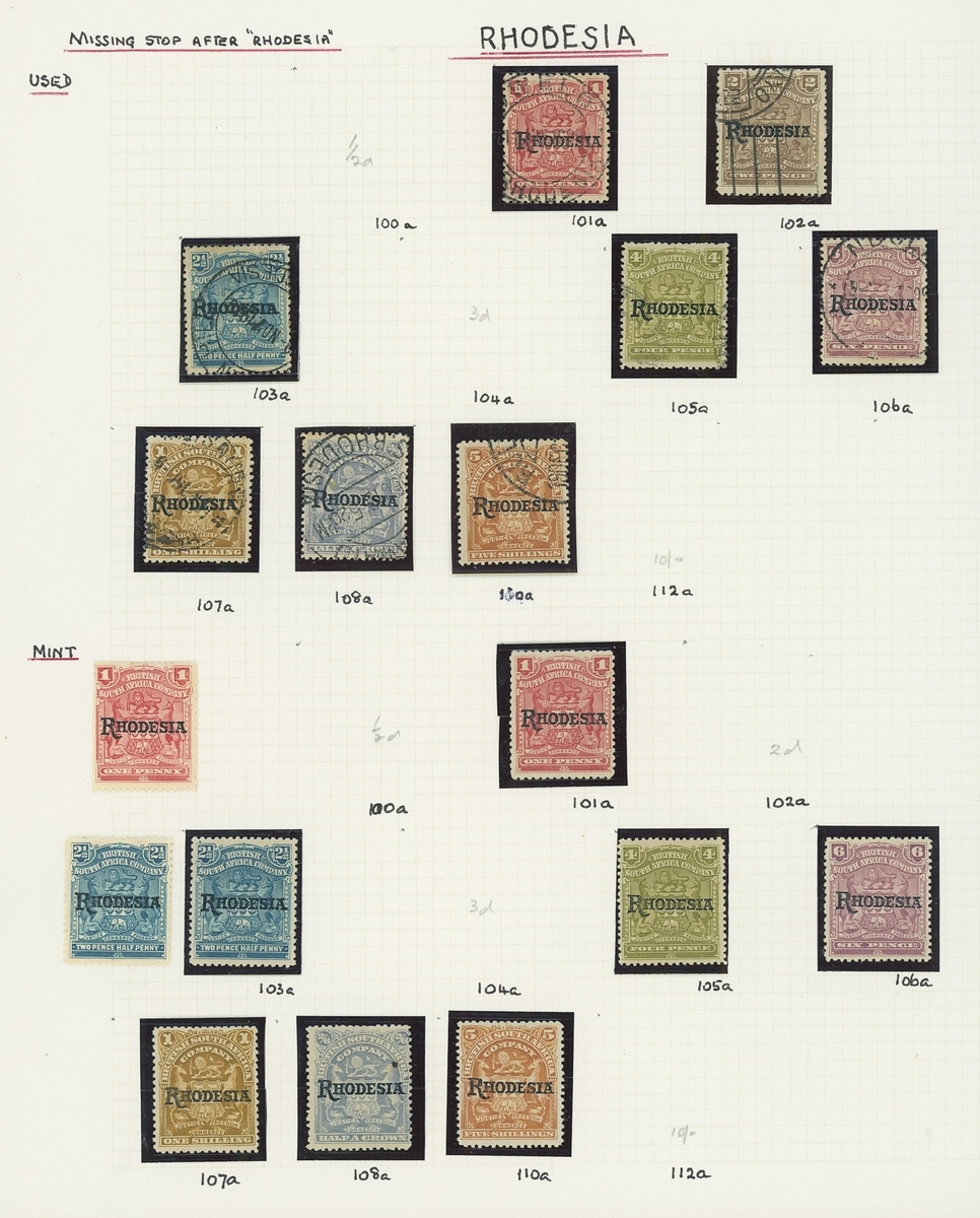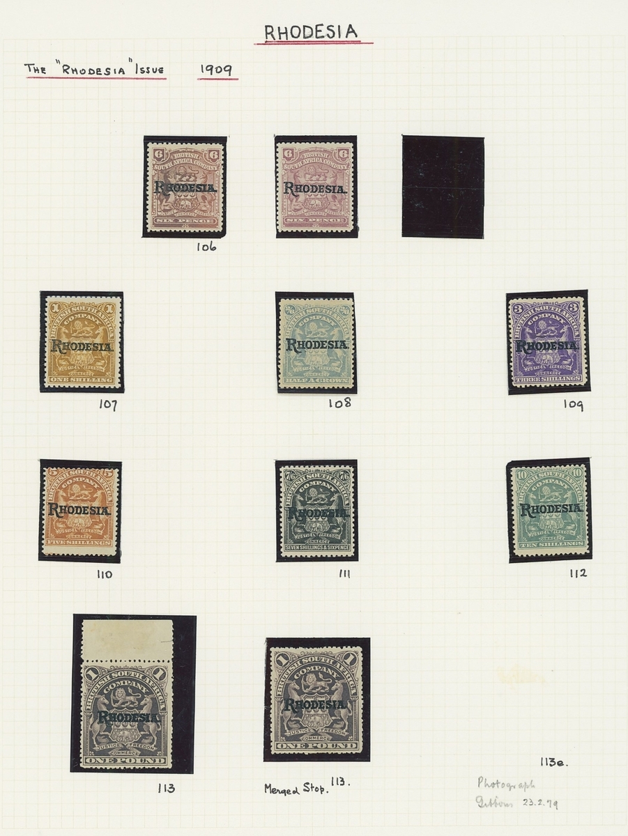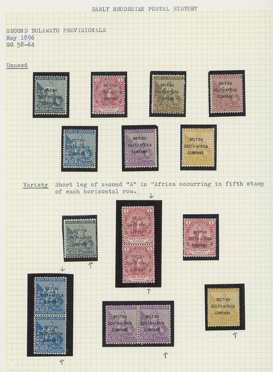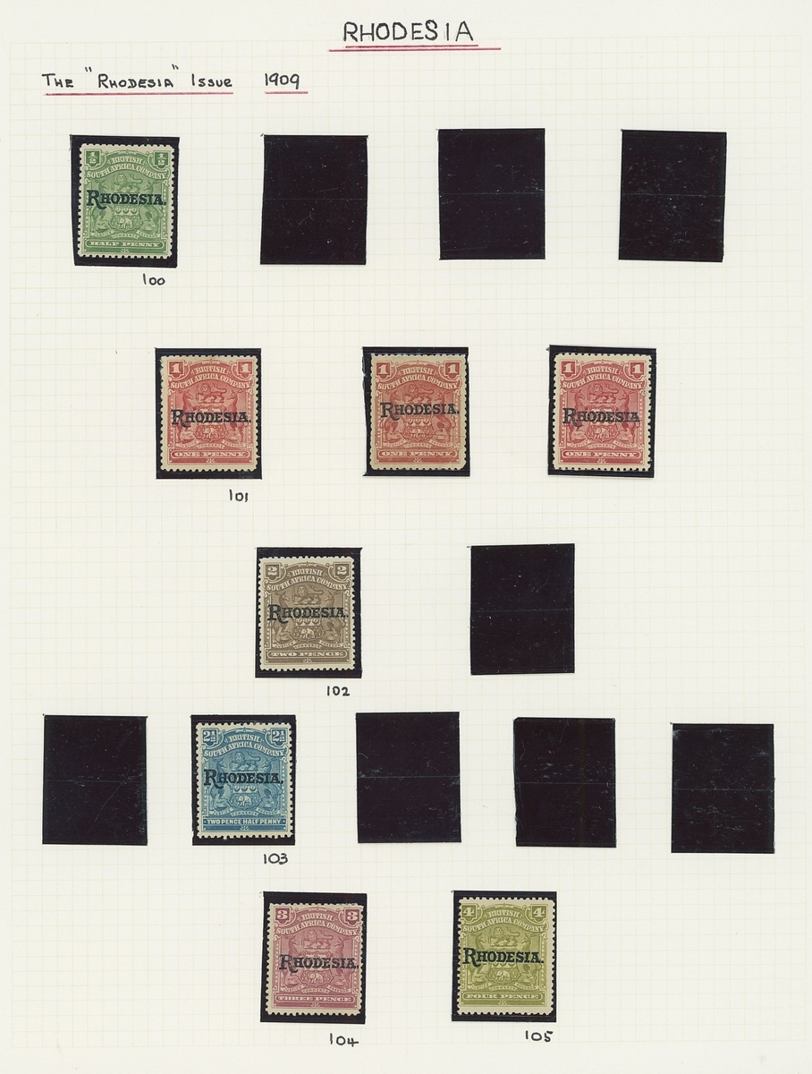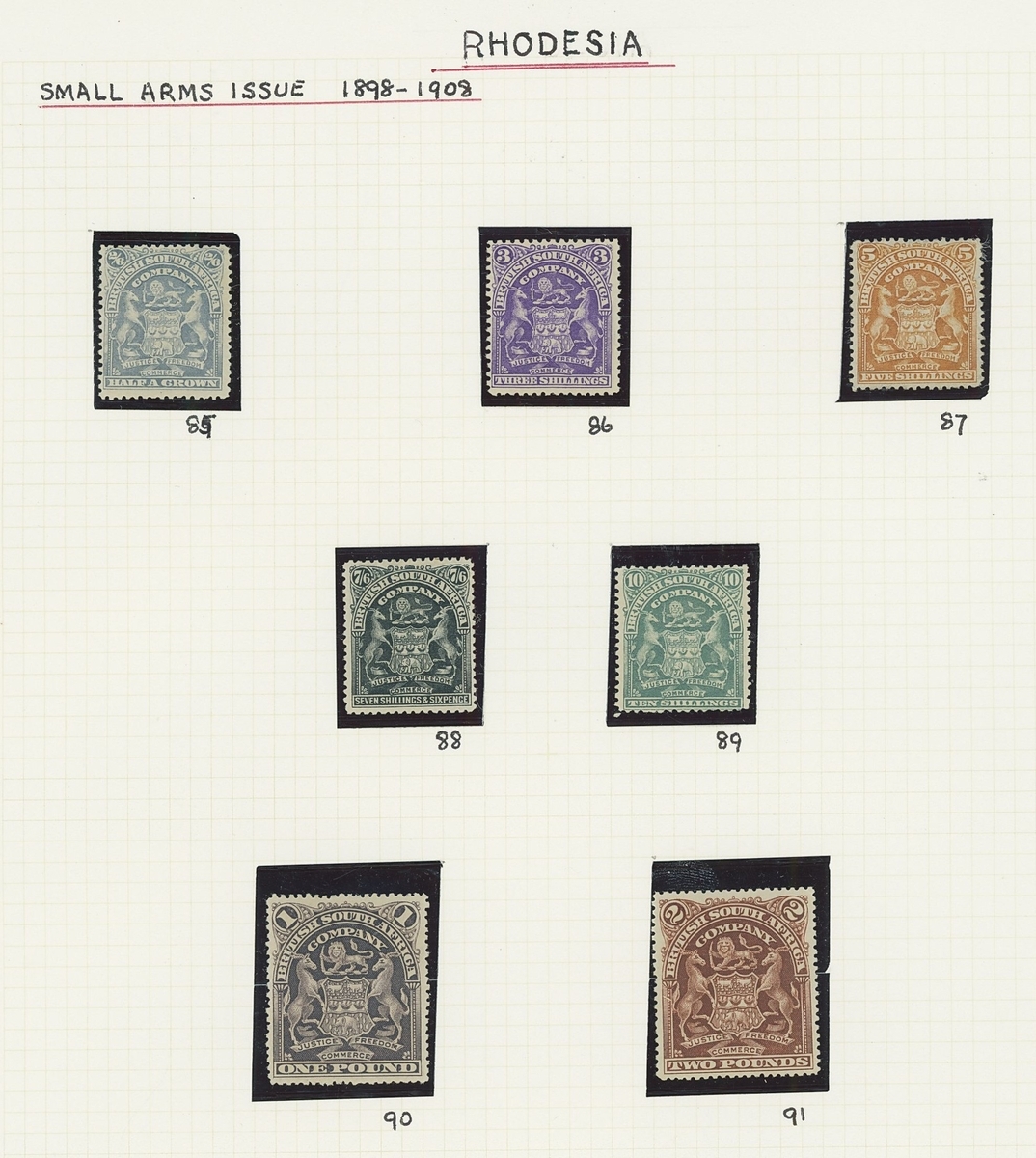 1892-1909 mint collection on album pages including 1892 Arms 1d. to £2, 1892-94 set to 4/- and Perkins Bacon 2d. and 4d., 1896-97 Die I set to 4/-, Die II set to 10/-, 1896 Cape provisionals set to 1/- and with a few minor varieties additionally (6), 1897 set to £1, 1905 Falls set to 5/- and with a 5/- block of four, 1909-12 Rhodesia overprint set to £1 (2 £1 values), 1898-1908 Arms to £2 and with 1d. imperforate between stamp and margin; good to fine mint. S.G. cat value £6,000+