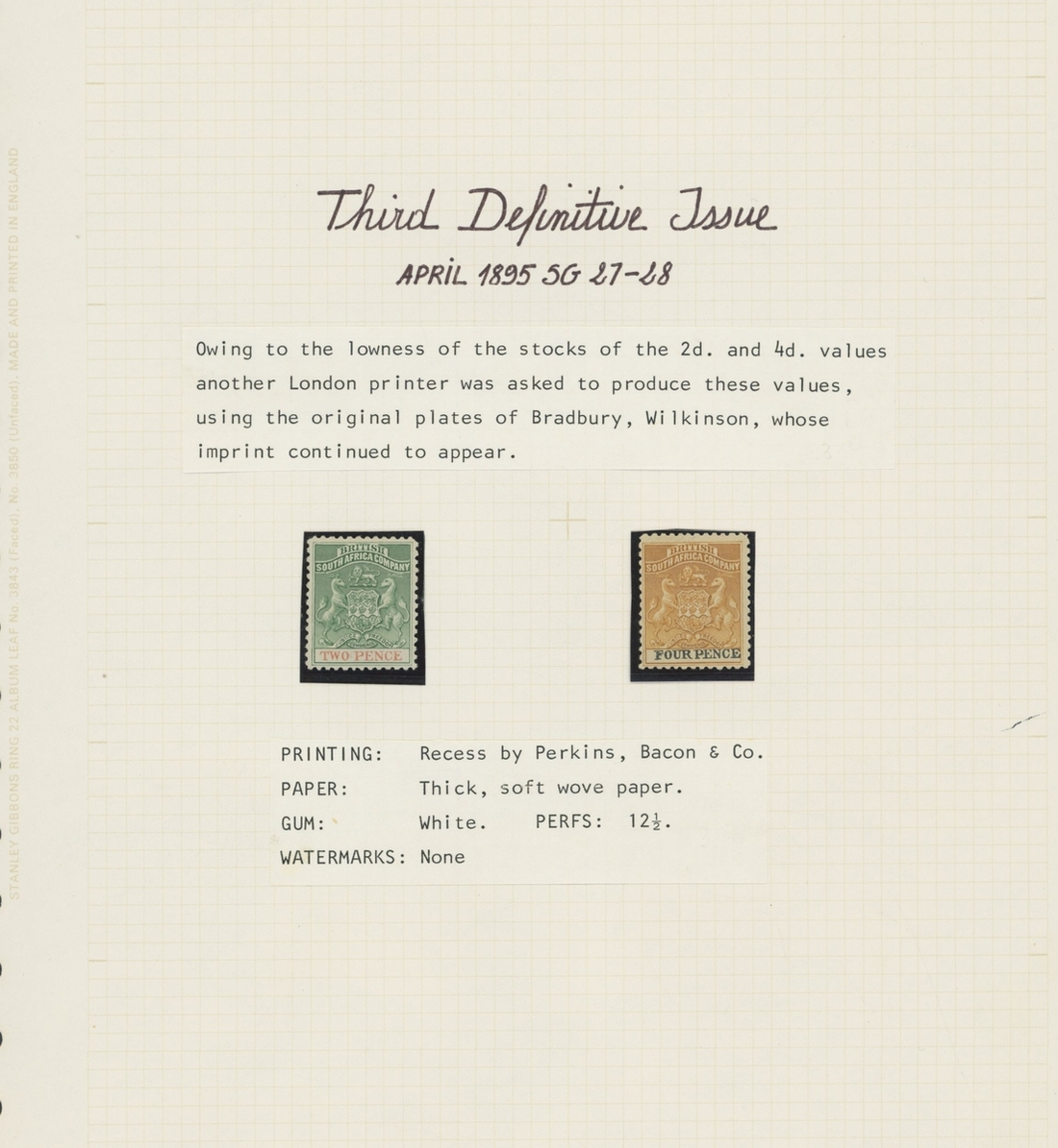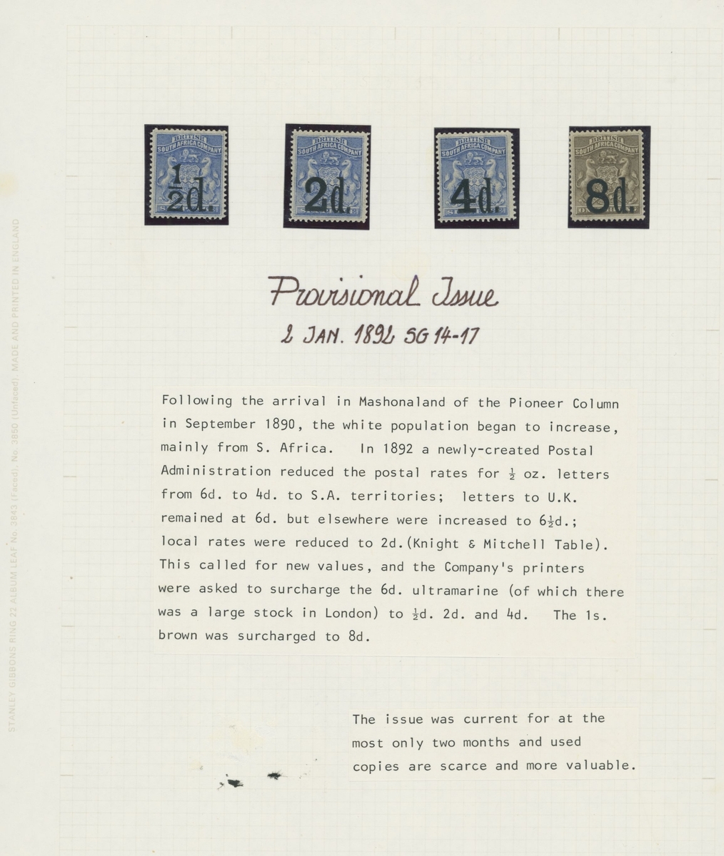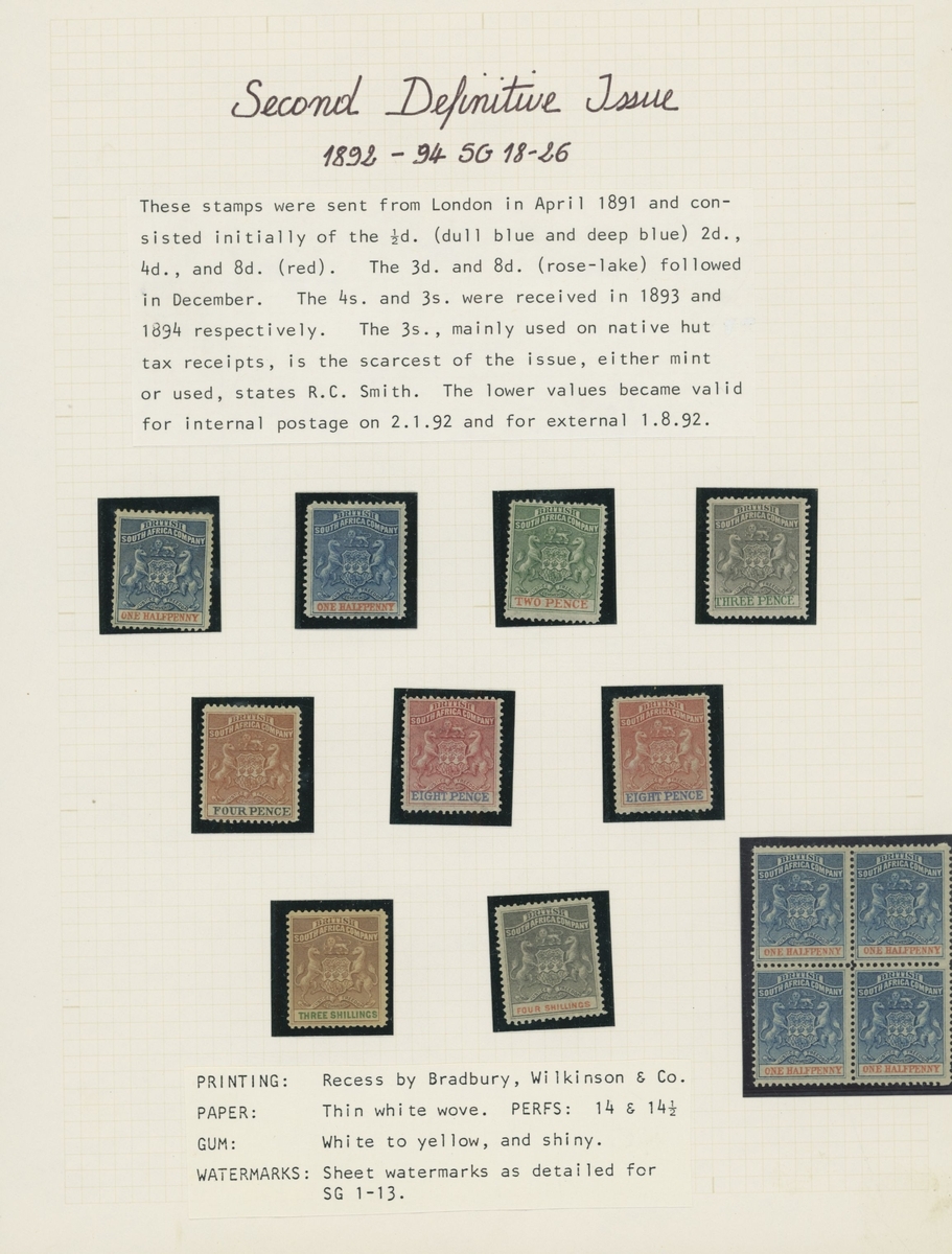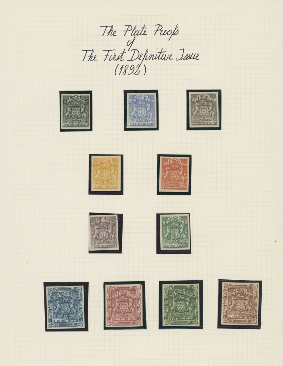 1892-1909 mint collection written up on album pages including 1892 1d. to £10 complete set of imperforate plate proofs, 1892 ½d. on 6d. to 8d. on 1/- Provisional set of four, 1892-94 set to 4/-, 1896 Matabele Provisional set of three, 1896 Cape provisional overprint set to 1/-, 1896-97 Arms sets to 4/- and Die II set to 10/- (set of nine overprinted
