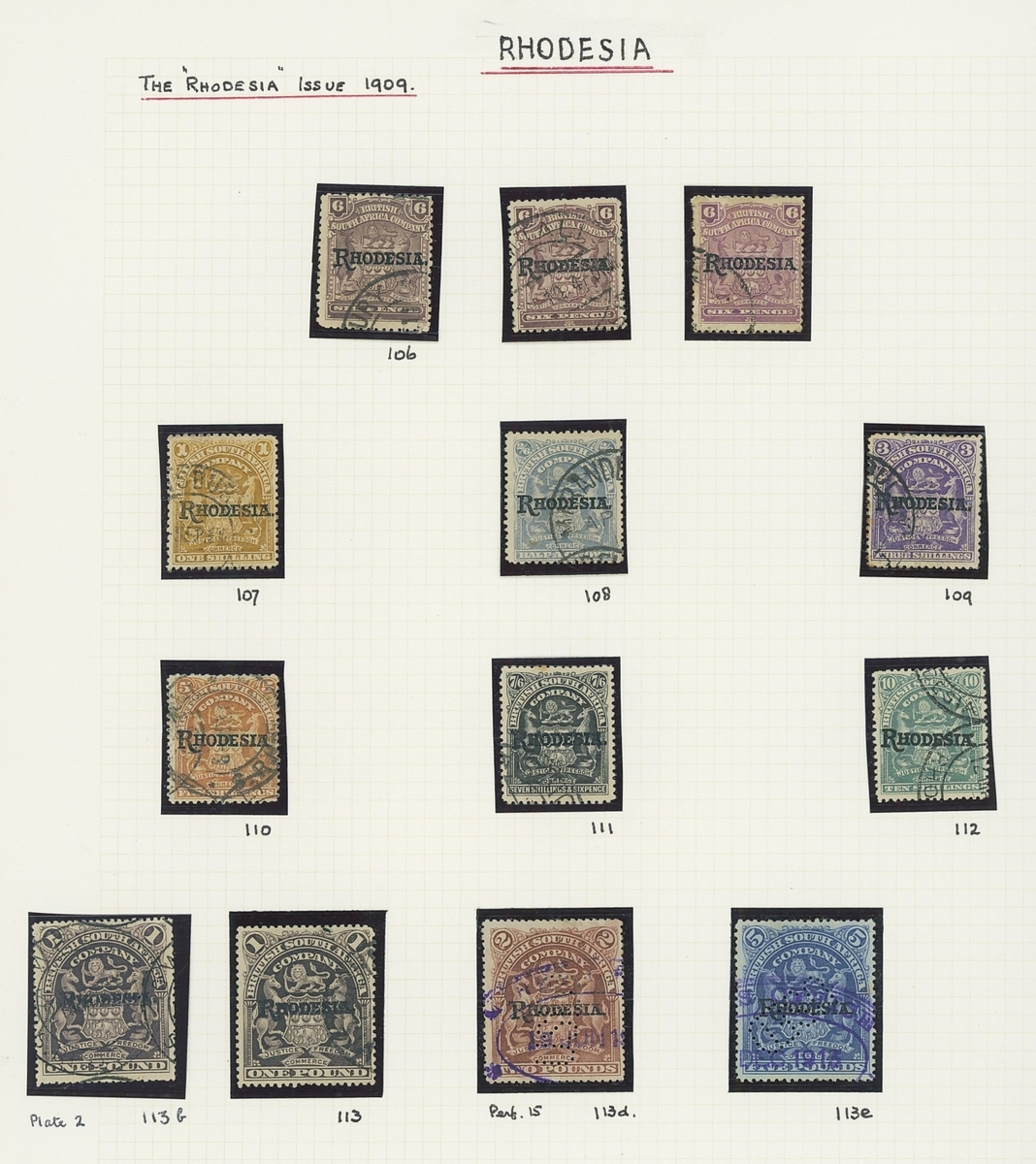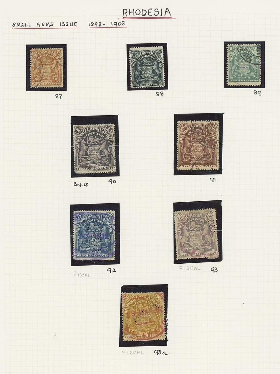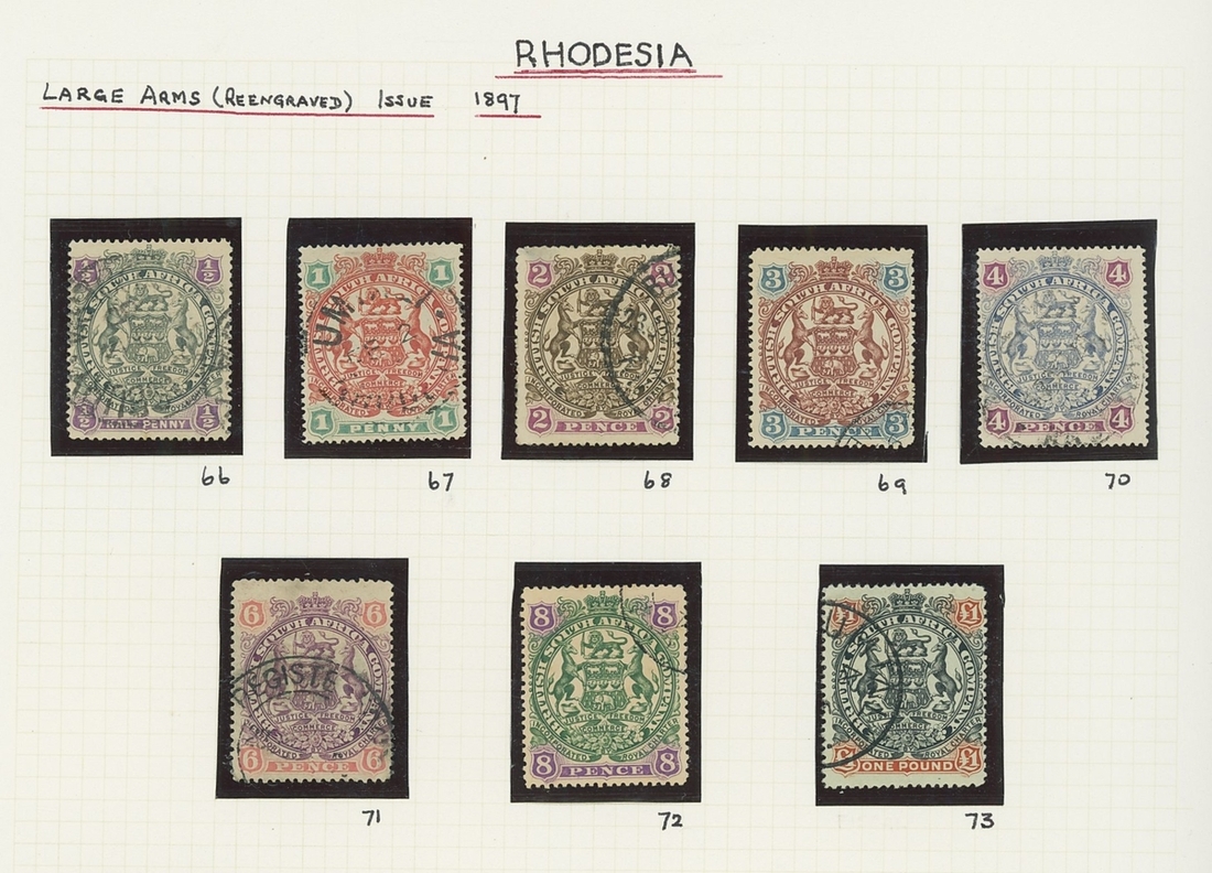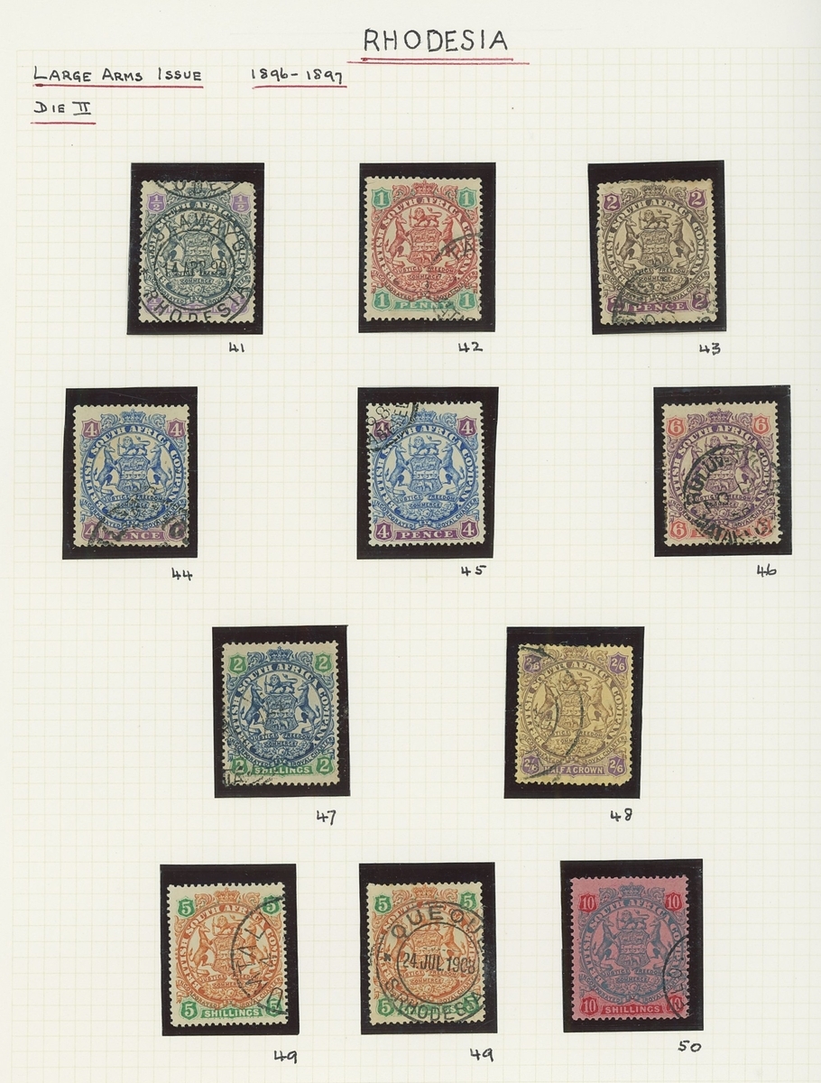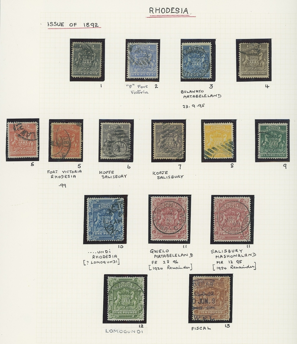 1892-1909 used collection on album pages including 1892 set to £10 (the £10 with fiscal cancellation), 1892-94 to 4/-, 1896 Cape provisional set to 1/-, 1896 Die I set to 4/-, 1896-97 Die II set to 10/-, 1897 set to £1, Marshall Hole cards (6), 1898-1908 Arms to £20 (£5, £10 and £20 with fiscal cancellations), 1905 Falls set to 5/- and with 5/- block of four, 1909 Rhodesia set to £5 (the £2 and £5 with fiscal cancellations), Rhodesia surcharges, etc.; good to fine