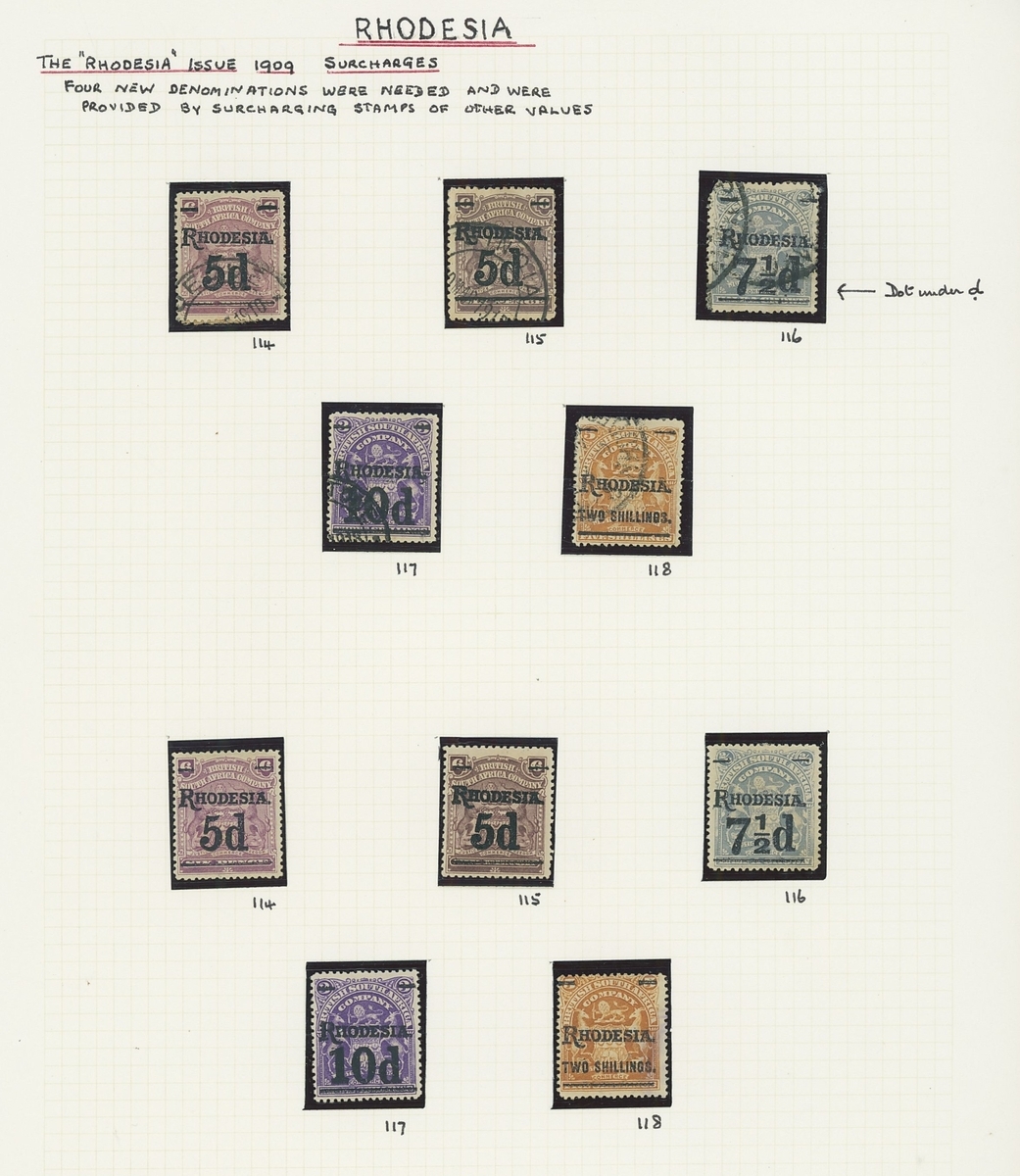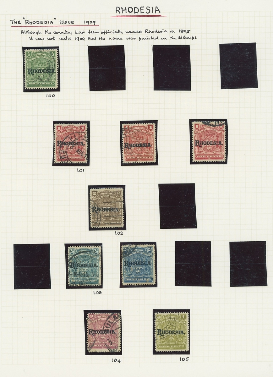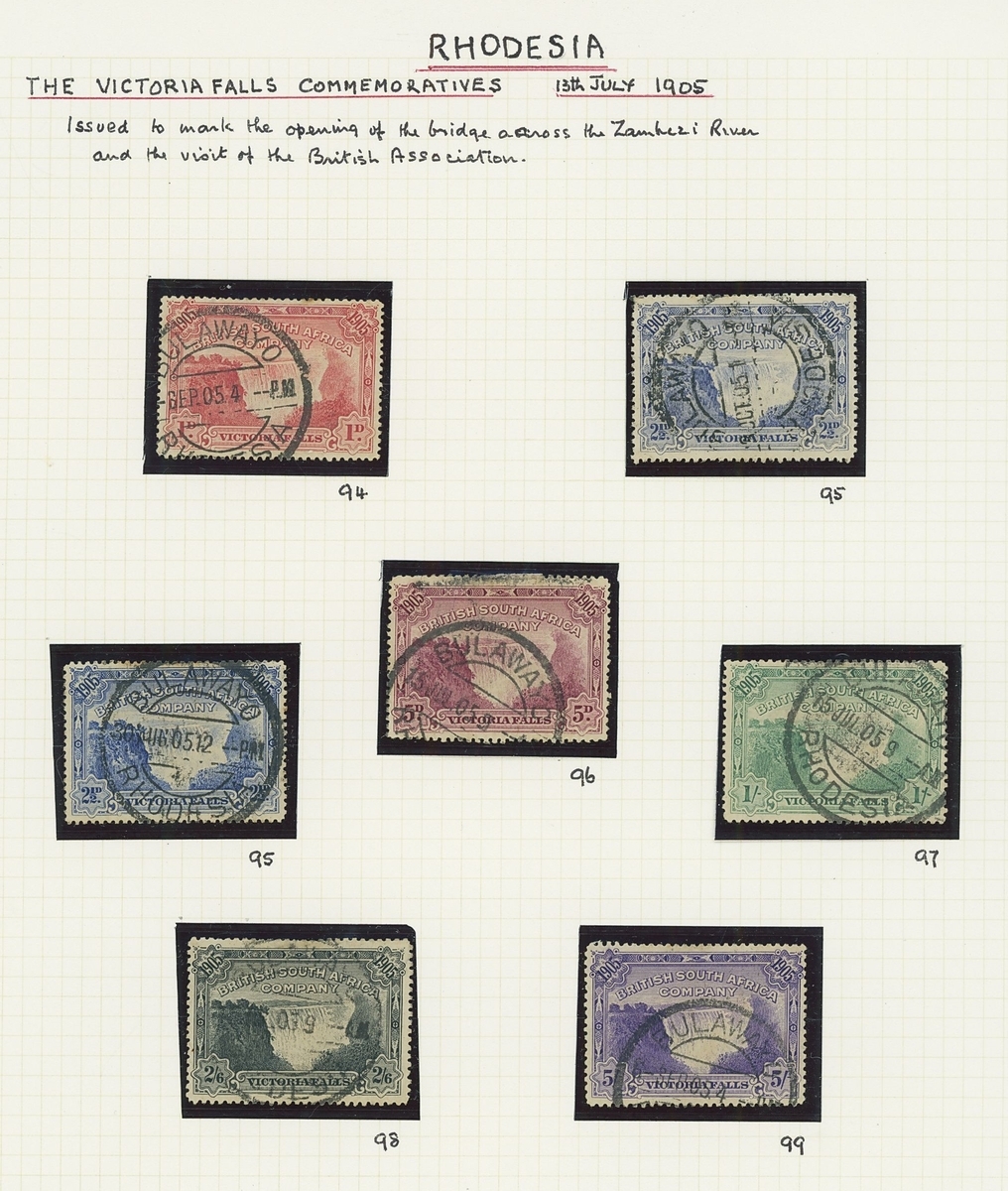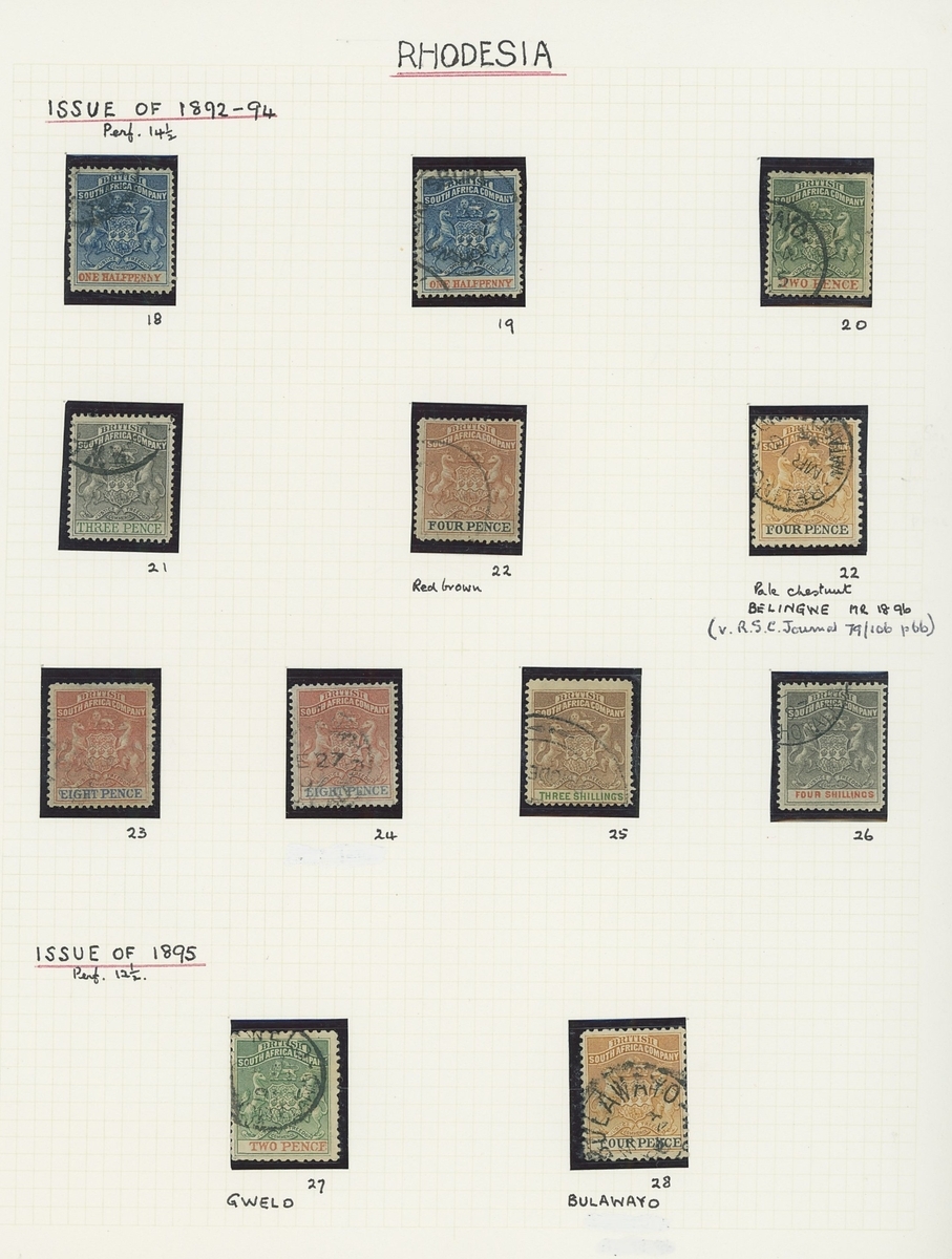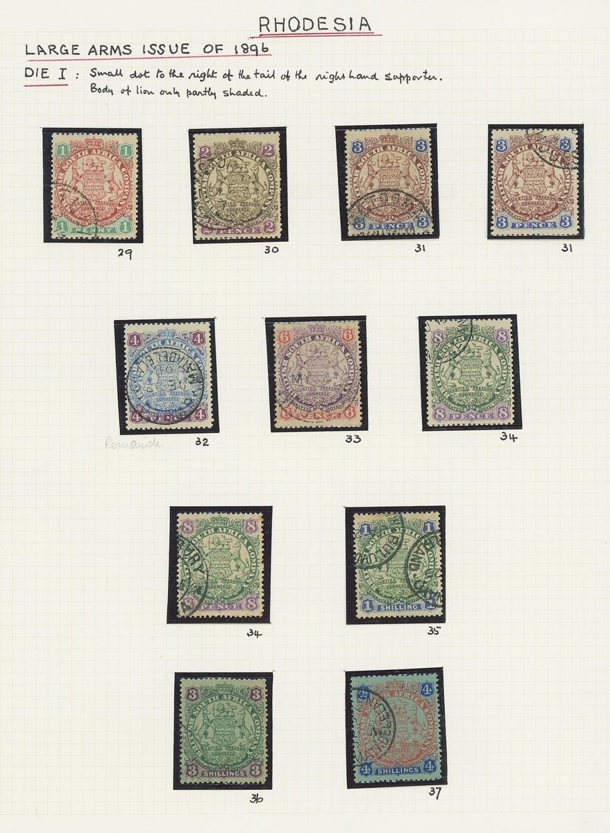 1892-1909 used collection on album pages including 1892 set to £10 (the £10 with fiscal cancellation), 1892-94 to 4/-, 1896 Cape provisional set to 1/-, 1896 Die I set to 4/-, 1896-97 Die II set to 10/-, 1897 set to £1, Marshall Hole cards (6), 1898-1908 Arms to £20 (£5, £10 and £20 with fiscal cancellations), 1905 Falls set to 5/- and with 5/- block of four, 1909 Rhodesia set to £5 (the £2 and £5 with fiscal cancellations), Rhodesia surcharges, etc.; good to fine