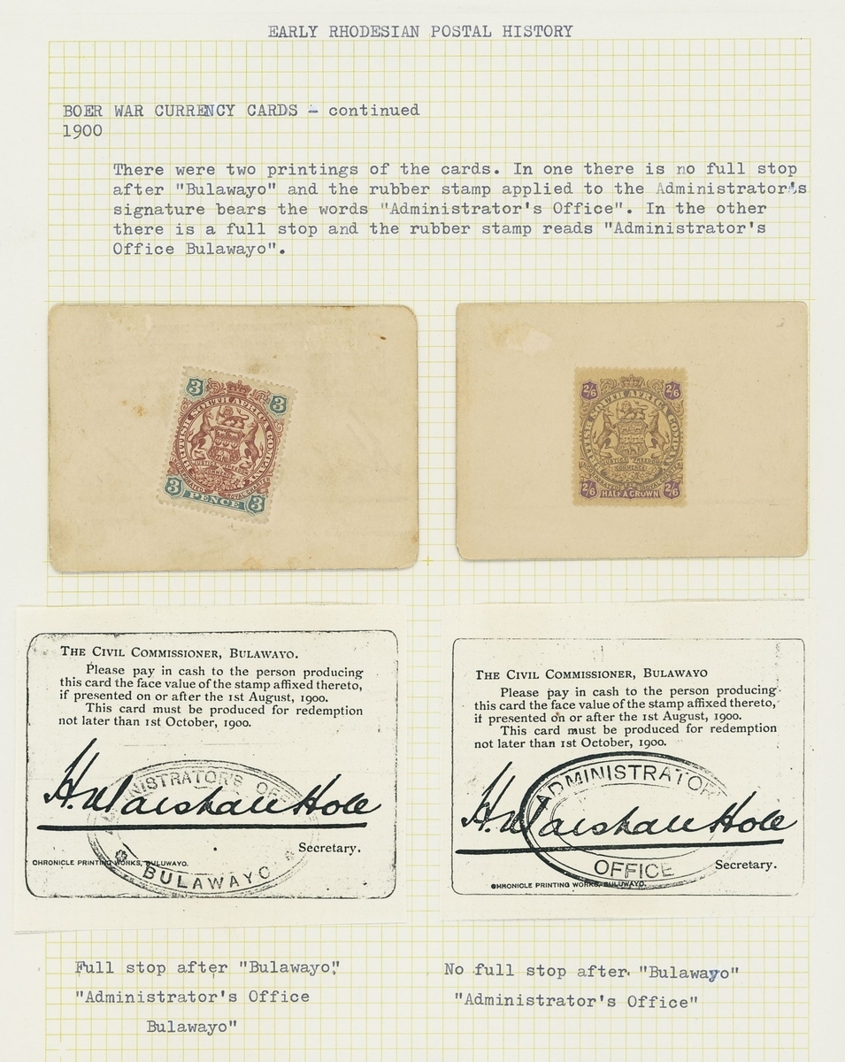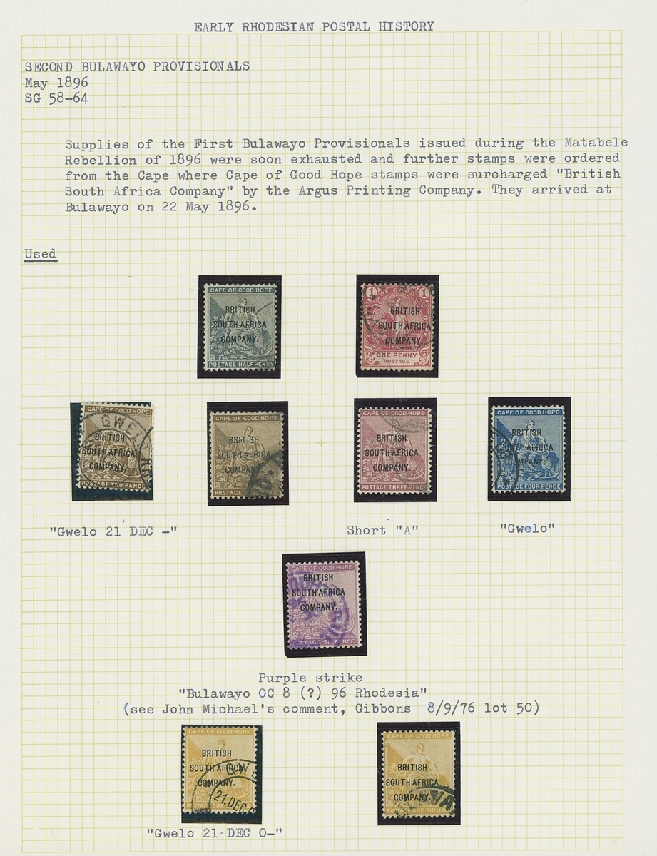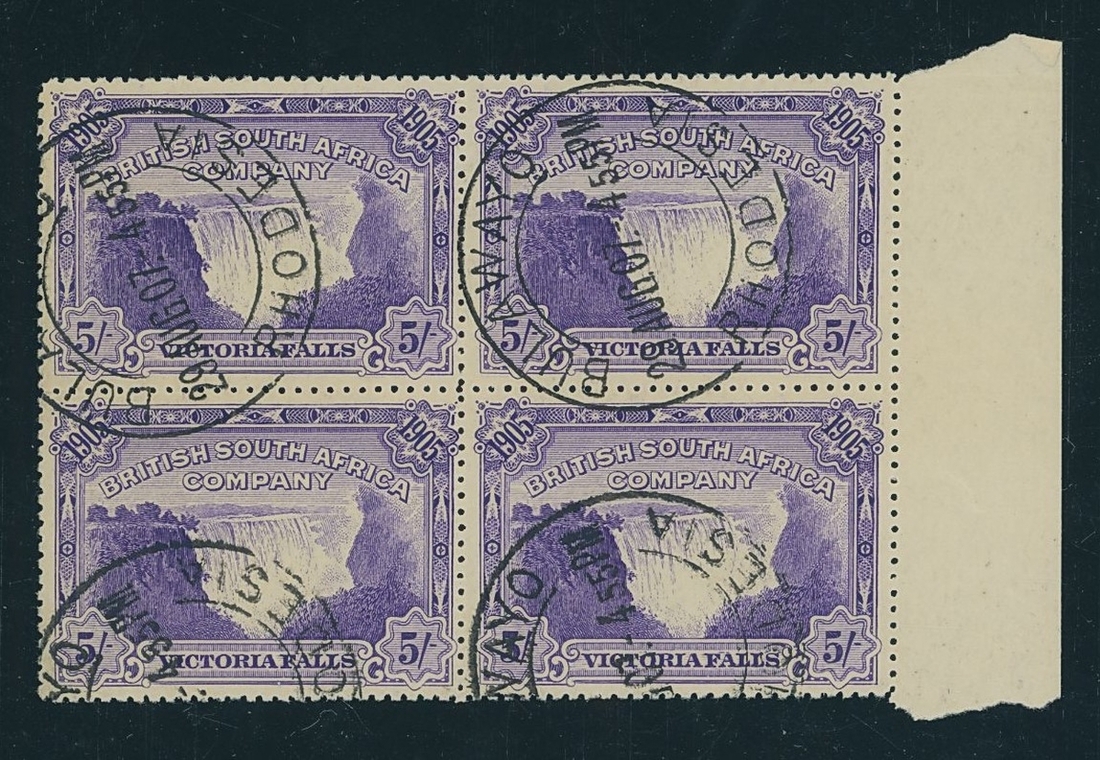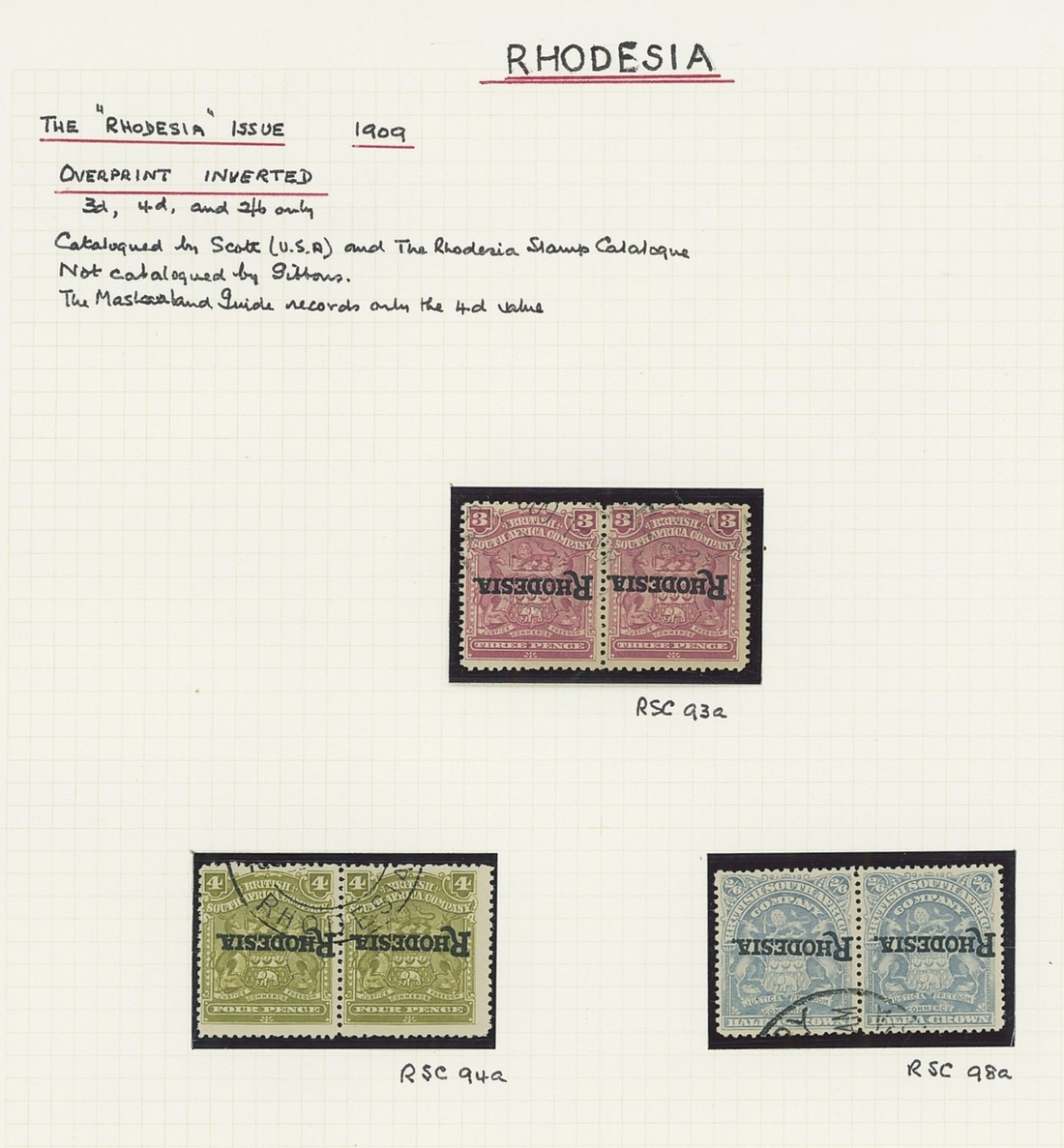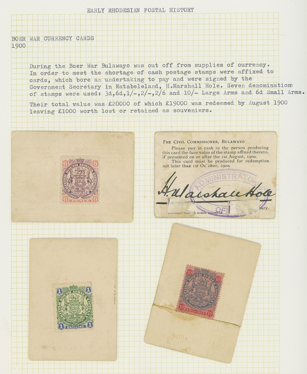 1892-1909 used collection on album pages including 1892 set to £10 (the £10 with fiscal cancellation), 1892-94 to 4/-, 1896 Cape provisional set to 1/-, 1896 Die I set to 4/-, 1896-97 Die II set to 10/-, 1897 set to £1, Marshall Hole cards (6), 1898-1908 Arms to £20 (£5, £10 and £20 with fiscal cancellations), 1905 Falls set to 5/- and with 5/- block of four, 1909 Rhodesia set to £5 (the £2 and £5 with fiscal cancellations), Rhodesia surcharges, etc.; good to fine