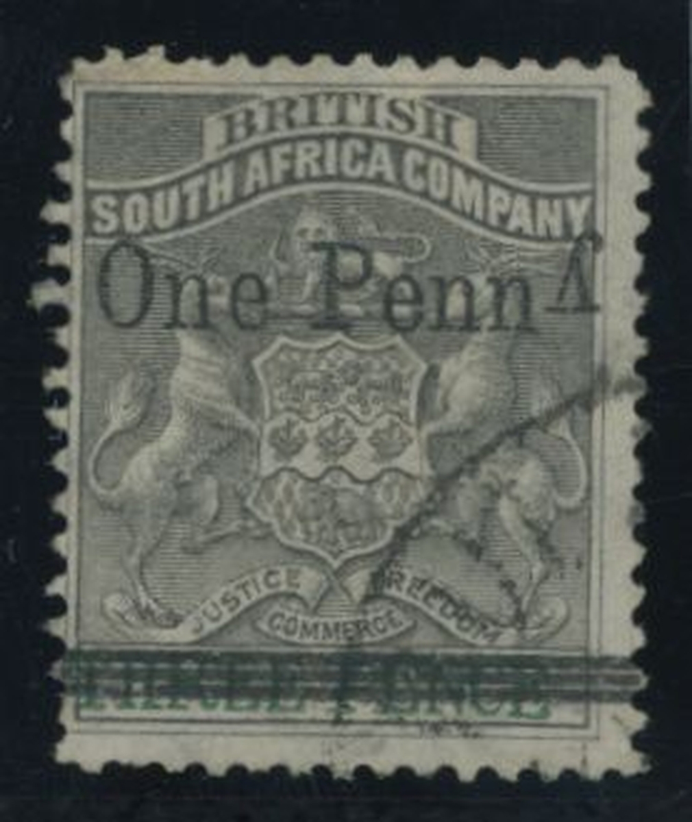 1d on 3d. grey-black and green, variety 'y' in 'Penny' inverted, used with part clear c.d.s. at lower right; the only known example of this variety which is listed by Stanley Gibbons but unpriced. A unique opportunity to purchase this key Rhodesian error which has been missing from virtually all of the most important Rhodesia collections including Vestey and Besancon; offered with a copy of the notes made by E. Kenneth Wright. R.P.S. Certificate (1982). S.G. 51b, unpriced