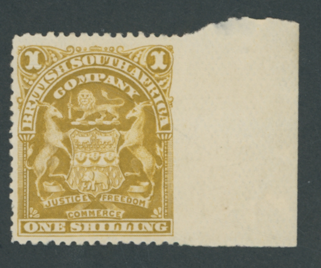 1898-1908 Arms 1/- bistre from the right of the sheet, variety imperforate between stamp and margin, large part original gum; fine and hugely rare. R.P.S. Certificate (1989). S.G. 84 var.