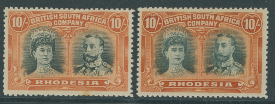 10/- deep myrtle and orange and 10/- blue-green and orange, the first with tiny age mark below the frameline at foot, otherwise fine and fresh mint. R.P.S. Certificates (1987) and (1989). S.G. 163, 164, £1,150