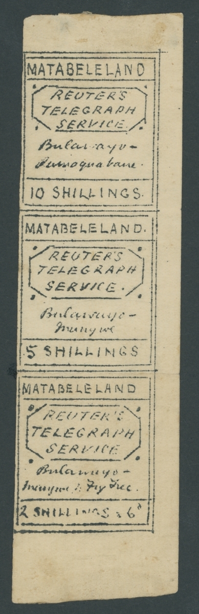 1894 (28 Mar.) a vertical se-tenant strip from the right of the sheet of the 2/6d., 5/- and 10/- cyclostyled in black on white vertically laid gummed paper with margins at top and foot, previously folded between each stamp and the 10/- with diagonal crease through it; nevertheless rare. R.P.S. Certificate (1975). S.G. T1a, £3,500