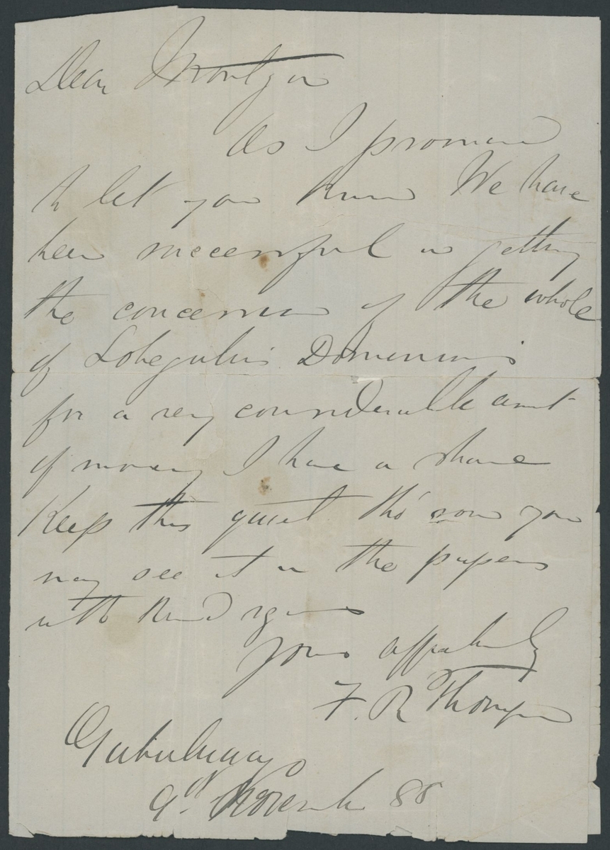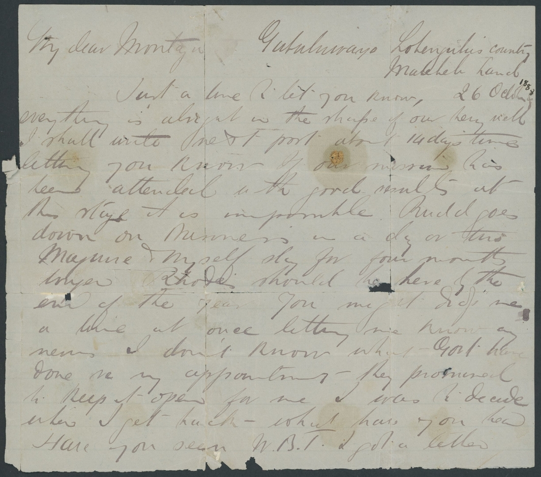 1888 (Oct.) pair of letters (no envelopes) in the hand of and signed by F. R. Thompson written at the time of the mission to secure a mining contract on behalf of Cecil Rhodes; The first letter written on 26th October from Gubulawayo, four days before the concession was signed, the identity of 'Montagu' has not been established, but from the context it would seem that he was a relation; the second letter was written on 9th November and records the success of the mission; fascinating and historically important letters (2), the lot is accompanied by a number of useful notes and correspondence from E. Kenneth Wright