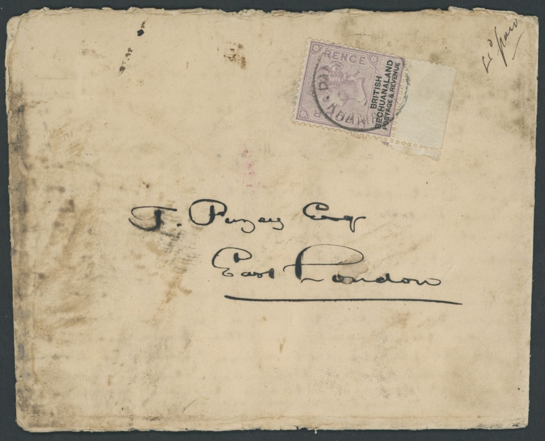 1890 (12 Oct.) entire letter from Arthur Puzey to his father in East London, written at the Mazoe River just before he set out for Manicaland, bearing British Bechuanaland 1887 4d. lilac and black from the foot of the sheet (S.G. 13) tied to cover by