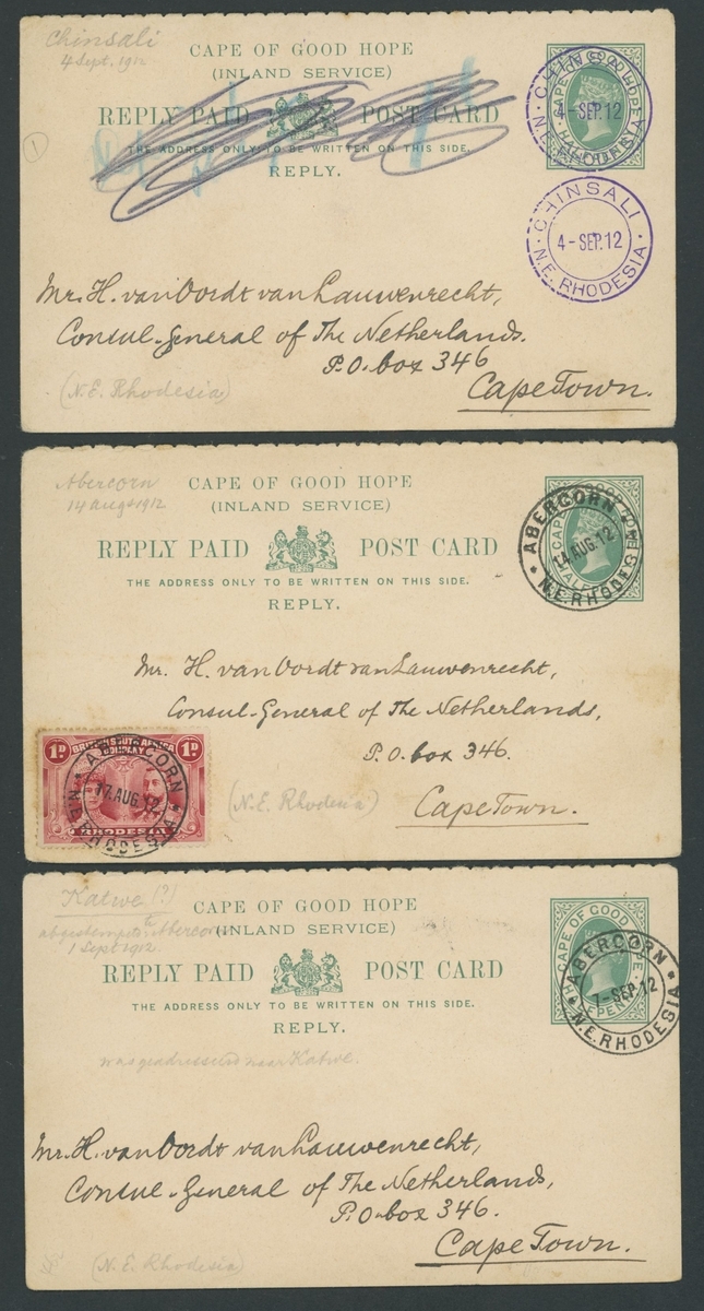 The following seven lots comprise Cape of Good Hope reply post cards sent by H. van Oordt von Lauwenrècht when Consul General for the Netherlands in Cpae Town during the years 1911 and 1912. He wrote to all postmasters in Southern Africa: