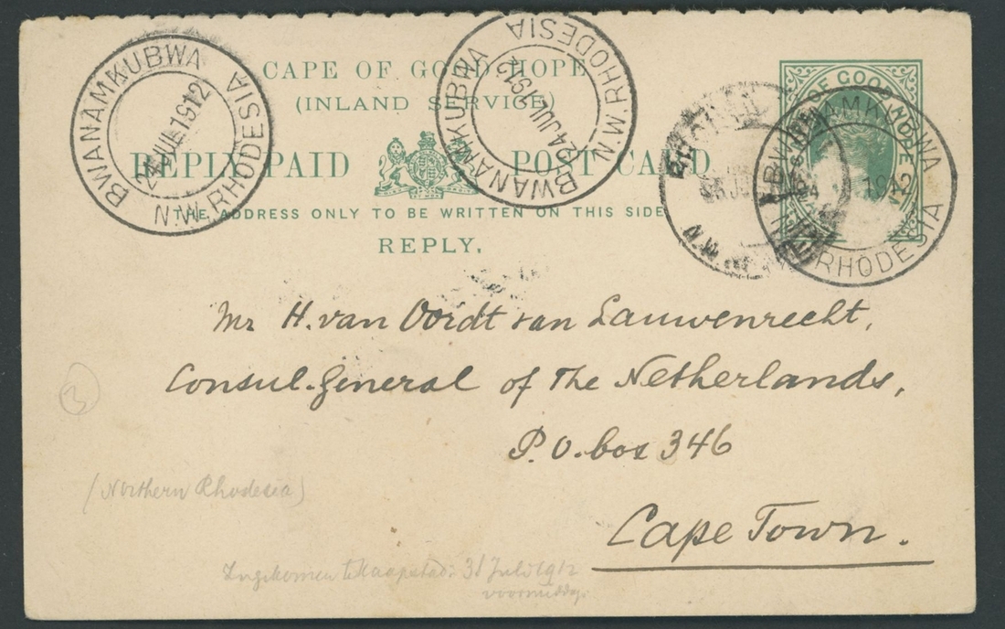 The following seven lots comprise Cape of Good Hope reply post cards sent by H. van Oordt von Lauwenrècht when Consul General for the Netherlands in Cpae Town during the years 1911 and 1912. He wrote to all postmasters in Southern Africa: