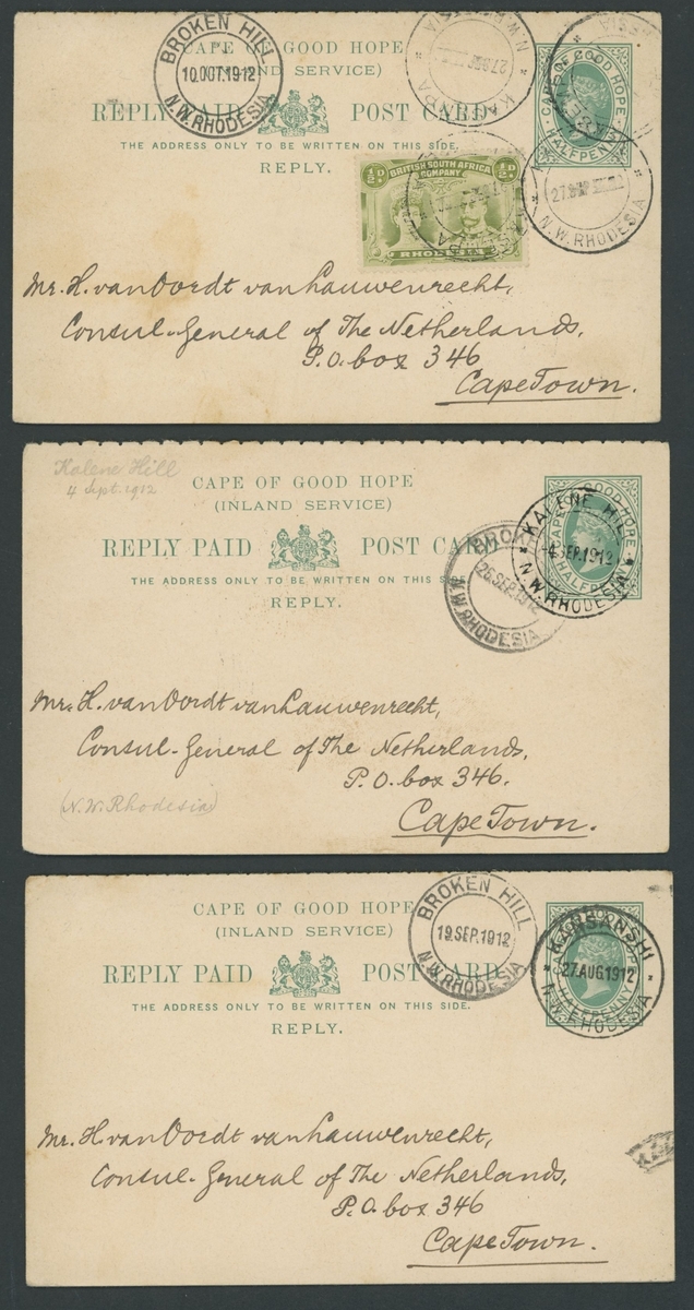 The following seven lots comprise Cape of Good Hope reply post cards sent by H. van Oordt von Lauwenrècht when Consul General for the Netherlands in Cpae Town during the years 1911 and 1912. He wrote to all postmasters in Southern Africa: