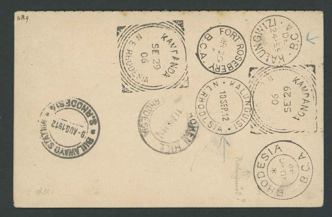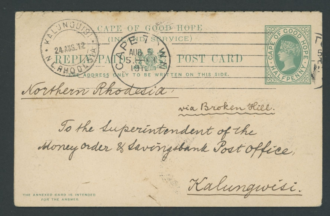 "As I am collecting the postmarks of all post offices in South Africa for my private musuem, containing anything connected with the postal, telegraphic and telephonic communications in Africa you will oblige me very much by returning to me the annexed reply card. When obliterationg it please take care the impression of your date stamp is as clear as possible"