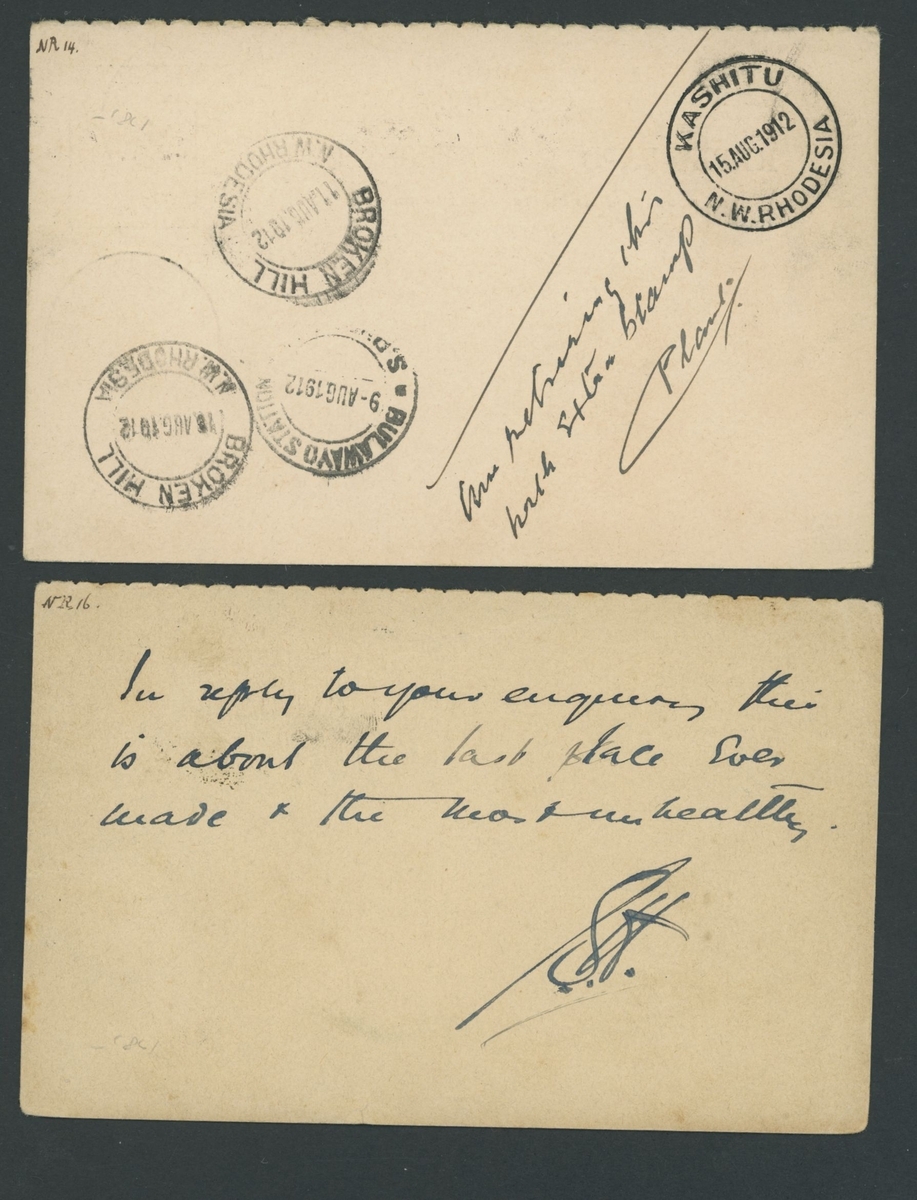 "As I am collecting the postmarks of all post offices in South Africa for my private musuem, containing anything connected with the postal, telegraphic and telephonic communications in Africa you will oblige me very much by returning to me the annexed reply card. When obliterationg it please take care the impression of your date stamp is as clear as possible"