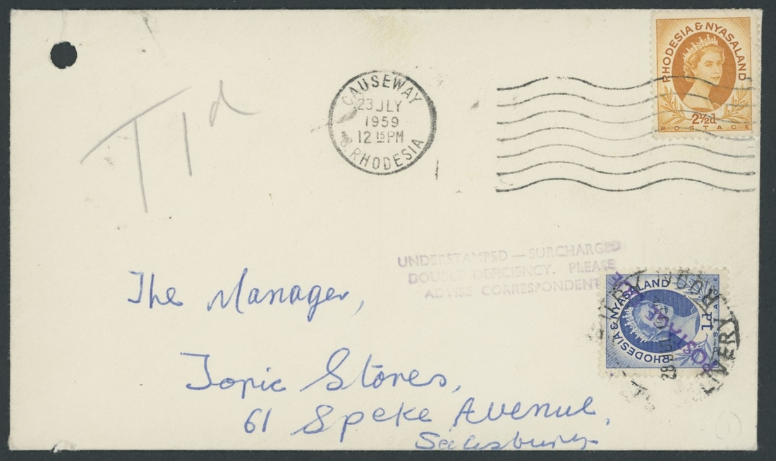 Note: In 1959 following the increase in the postal rate to 3d., there were a large number of letters sent with insufficient postage paid. The Salisbury Post Office ran out of Southern Rhodesian postage due stamps and resorted to using ordinary postage stamps to denote the surtax. This created a certain amount of confusion, so these stamps were handstamped 'Postage Due'. No other post office adopted this practice, so the 'Salisbury Delivery Room' datestamp is the only authentic cancellation'