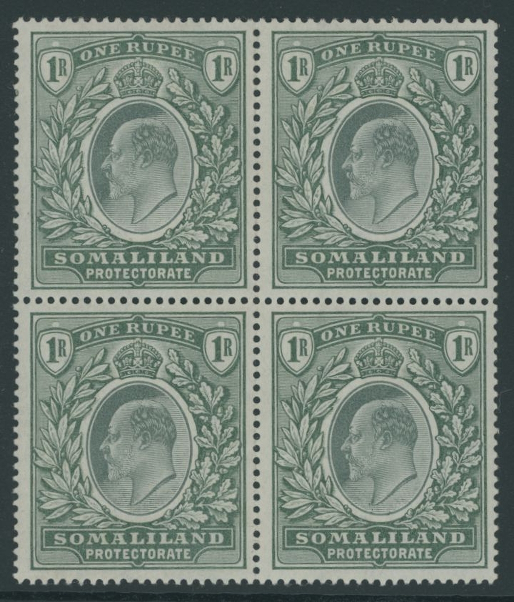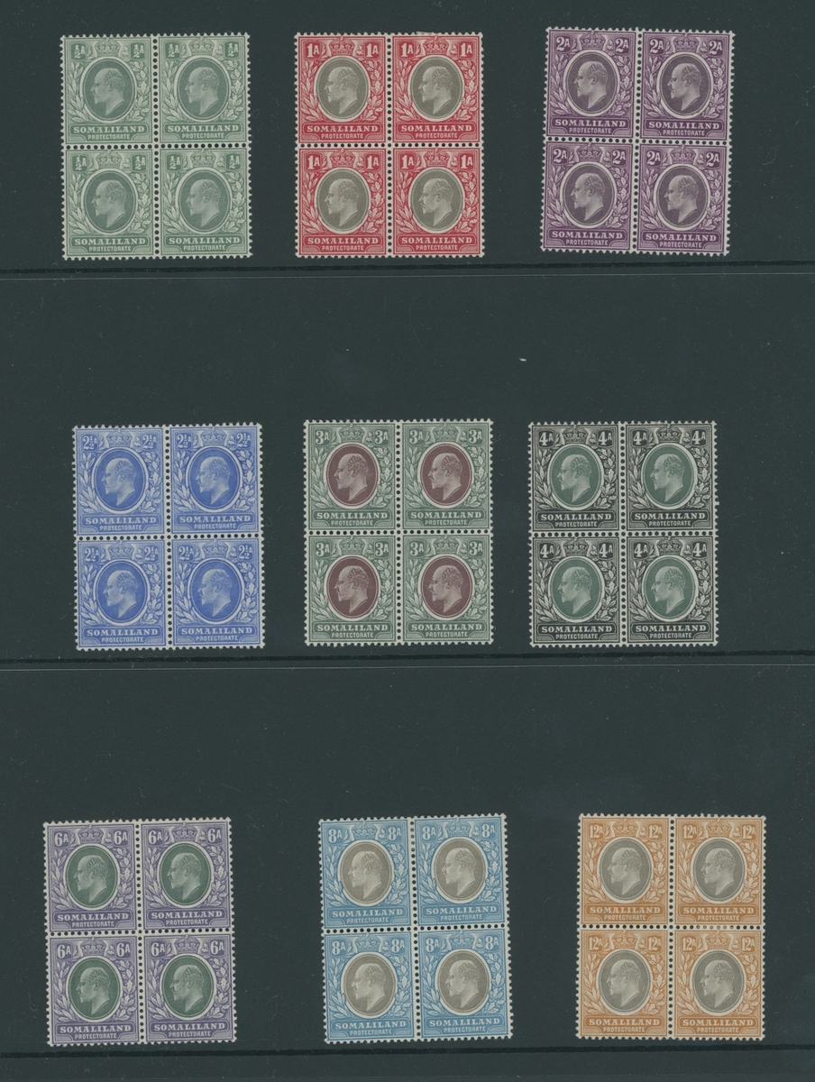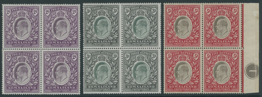 ½a. to 5r. set of thirteen, each value in a block of four, the 5r. with plate number '1', a few minor creases in places, large part original gum; scarce multiples. S.G. 32-44, £1,200+