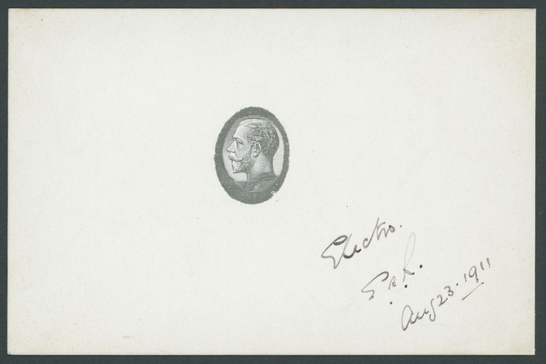 Mackennal head with uncleared surround, in black on white glazed card (82 x 60mm.), endorsed 'Electro.' in black ink, Initialled 'E A R ' (Evelyn Andros) and dated