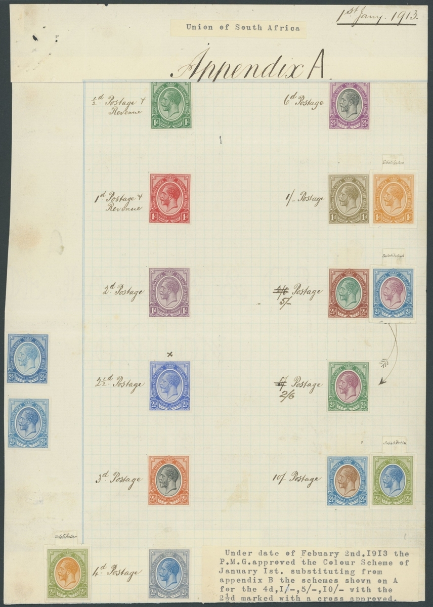 1913 (1 Jan.) De la Rue 'Appendix A' sheet with seventeen imperforate colour trials affixed showing the approved colour combinations with annotations comprising 1d. colour trials (5) in green, red, purple, bistre and orange and 2½d. trials (12) in bright blue, dull and pale blue, pale and bright blue, black and orange-red, blue and grey, orange-yellow and olive-green, black and violet, green and brown, purple and blue, purple and green, brown and light blue and deep blue and olive-green with annotations alongside and substitutions; the sheet folded at top for display and with collector's type-written notes attached at lower right; superb and rare